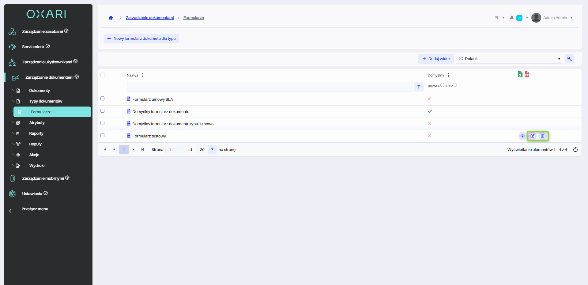 Aby edytować lub usuwać formularz, należy przejść do sekcji Zarządzanie dokumentami > Formularze. Najechać na pożądany formularz. Wyświetlą się przyciski do edytowania/usuwania.