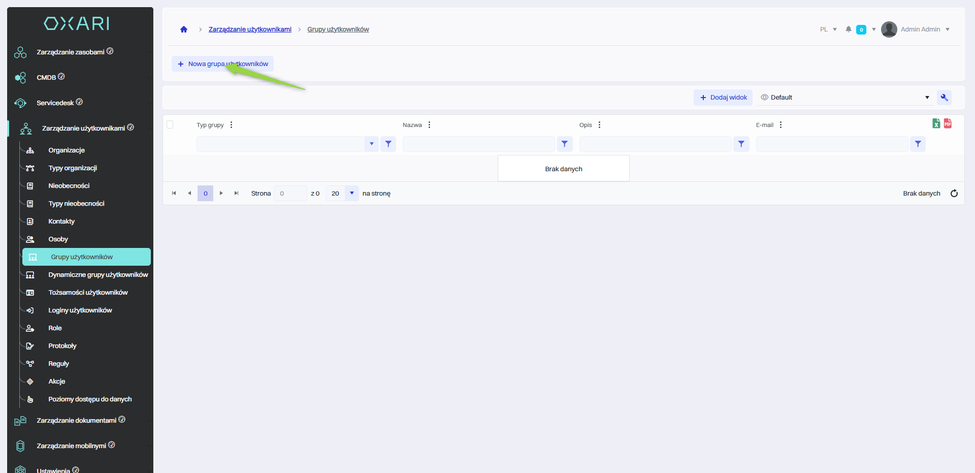 W celu dodania nowej grupy użytkowników należy przejść do sekcji Zarządzanie użytkownikami > Grupy użytkowników, a następnie kliknąć przycisk “Nowa grupa użytkowników”.