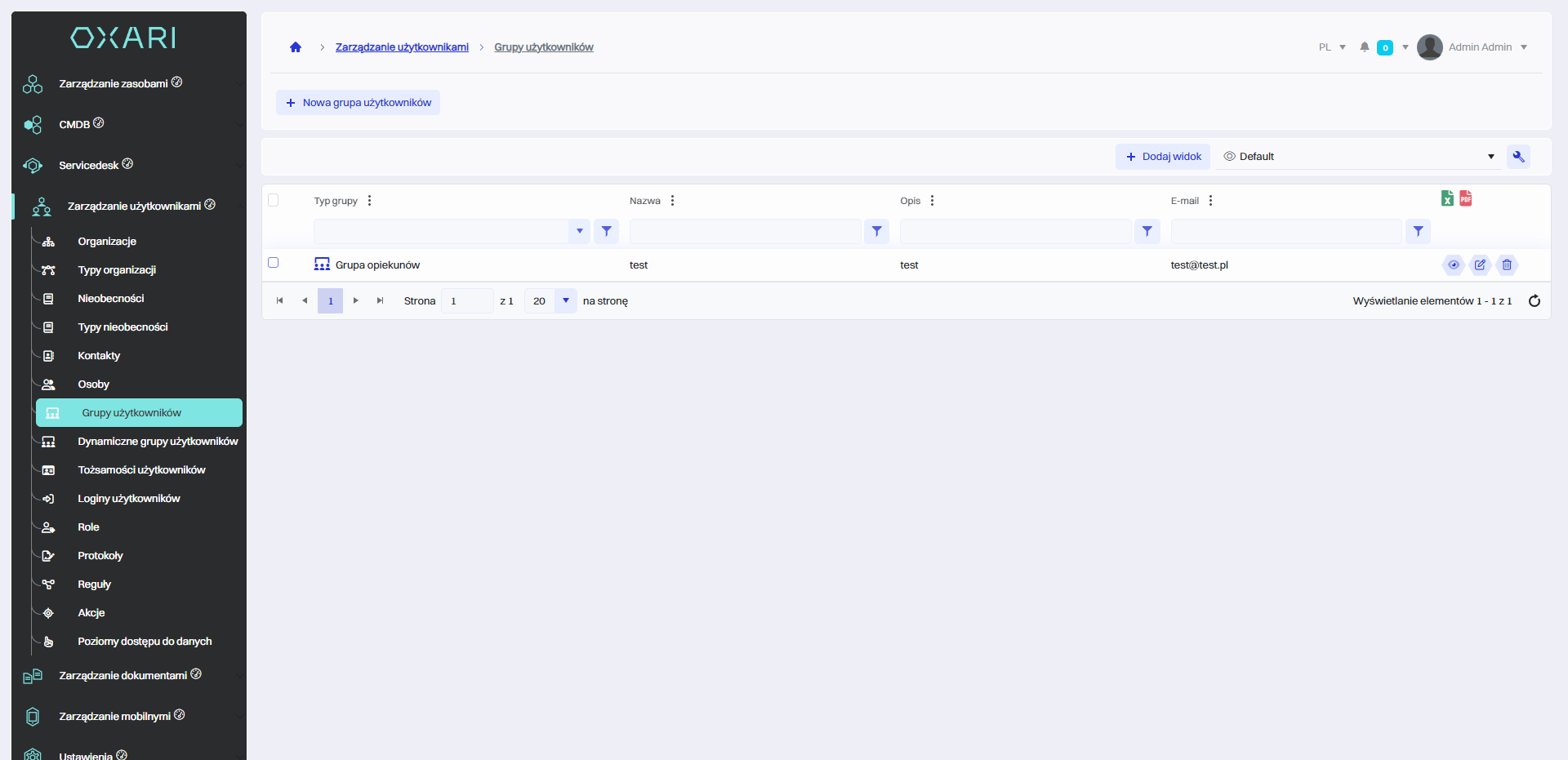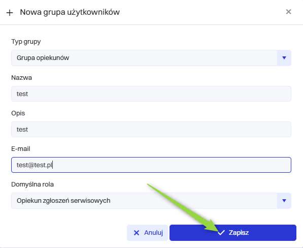 | 4 | E-mail - Pole na adres e-mail, który będzie przypisany do grupy użytkowników. Może być wykorzystywany do wysyłania powiadomień grupowych lub komunikacji. |