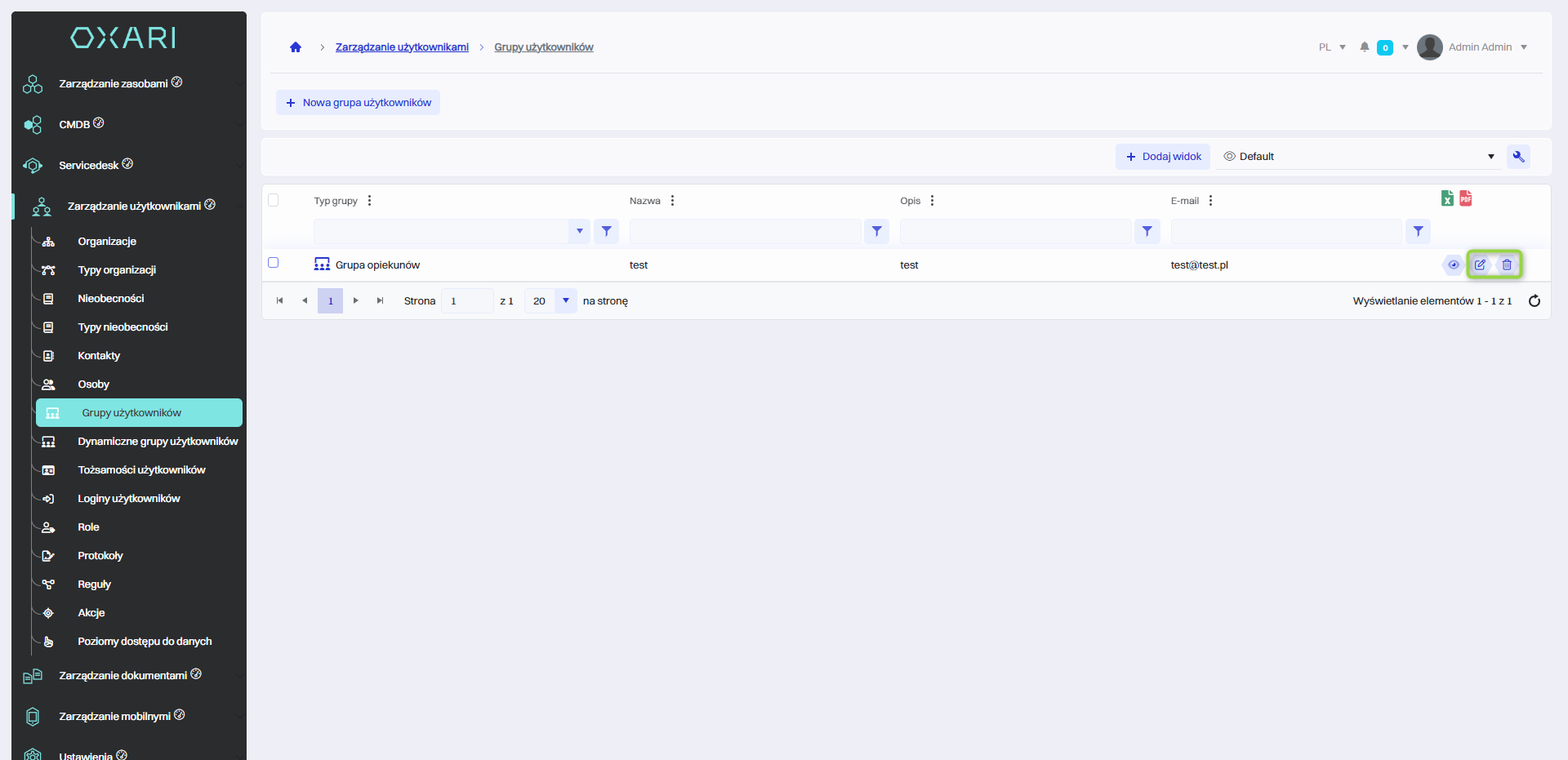 Aby edytować lub usuwać grupę użytkowników, należy przejść do sekcji Zarządzanie dokumentami > Grupy użytkowników. Najechać na pożądaną grupę. Wyświetlą się przyciski do edytowania/usuwania.