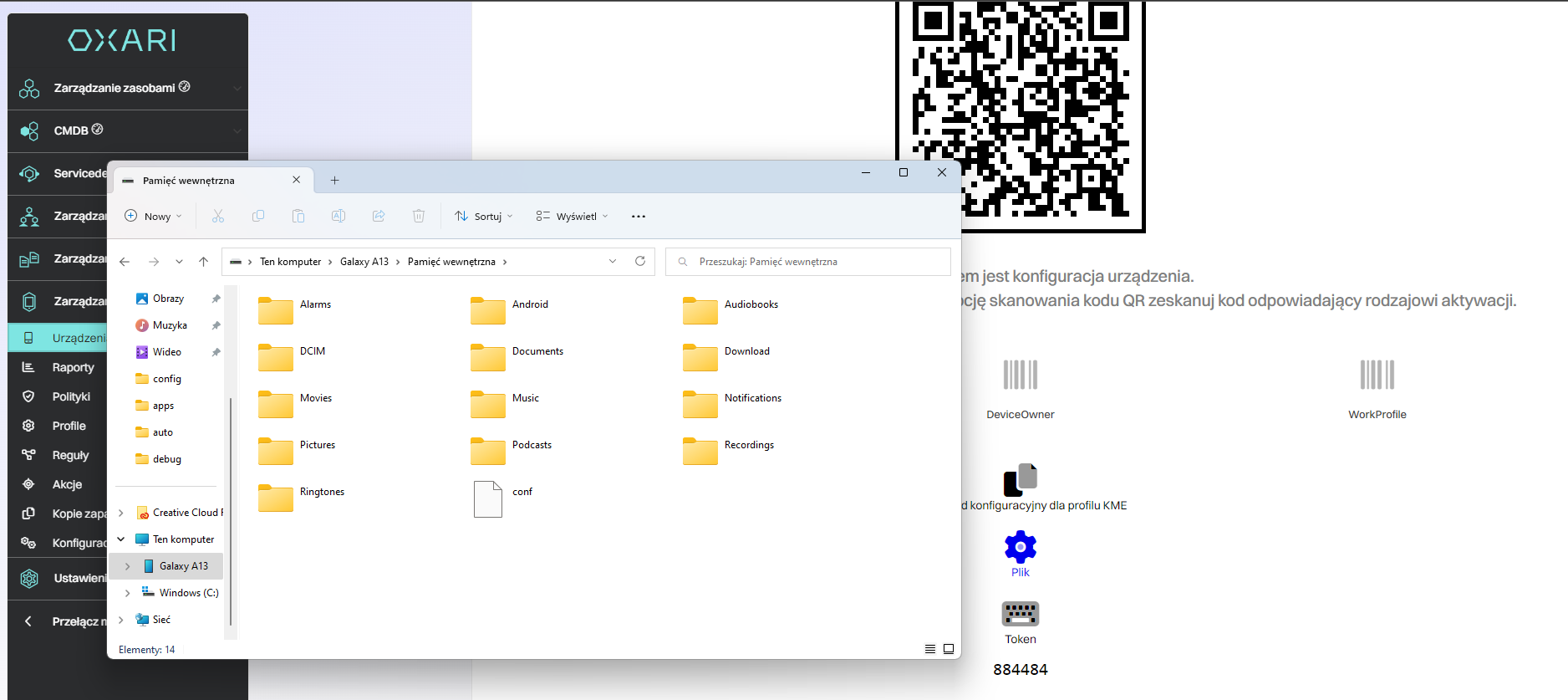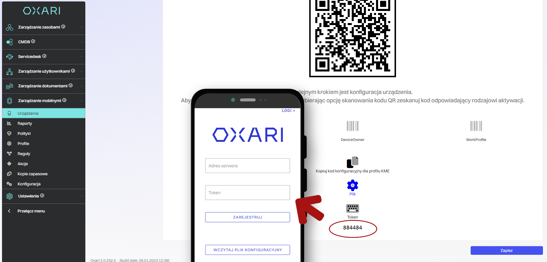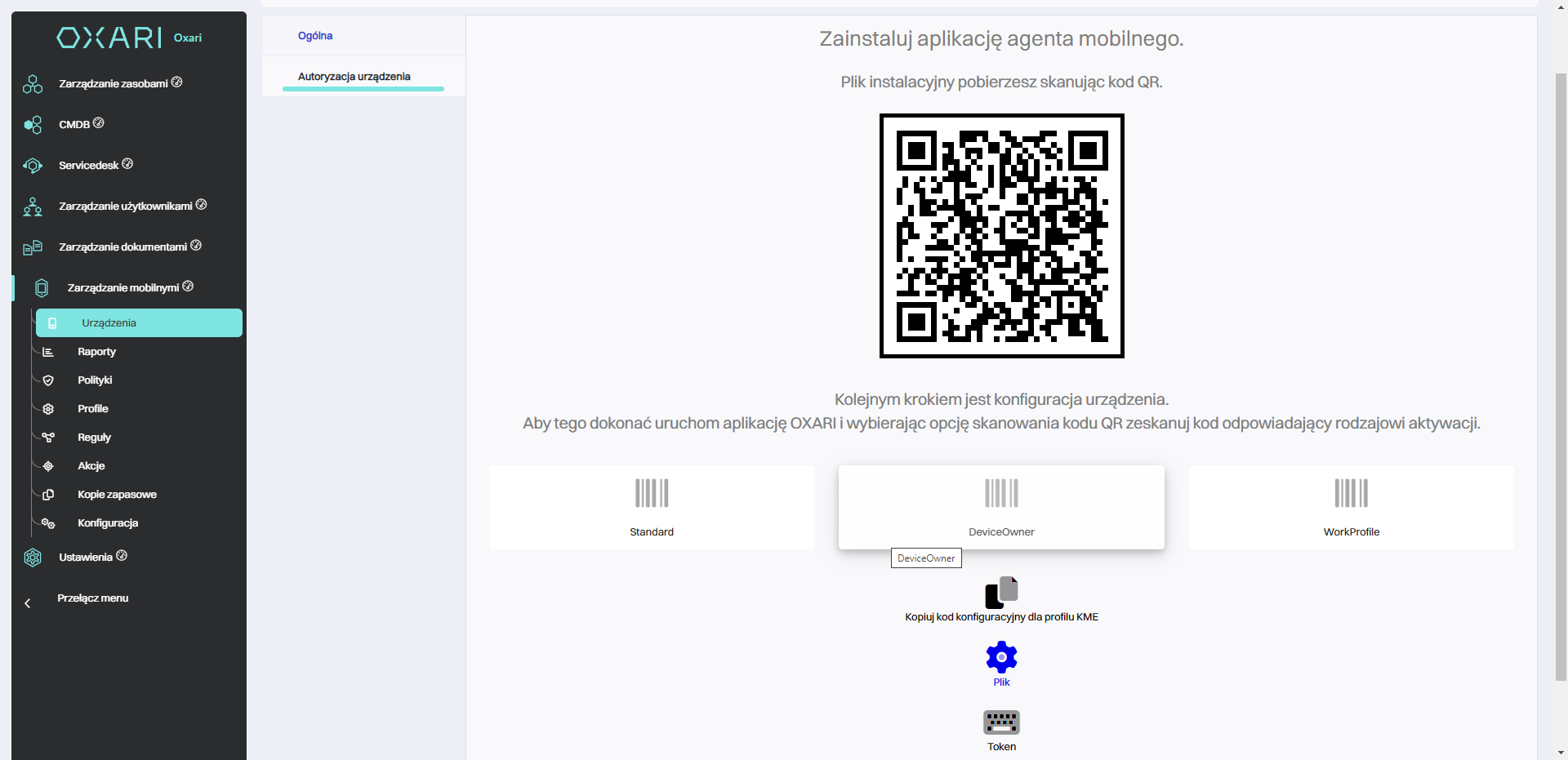 W tej zakładce można przeprowadzić operacje takie jak instalowanie aplikacji agenta mobilnego. Ułatwia to zarządzanie urządzeniami w organizacji poprzez szybkie rozprowadzanie oprogramowania za pomocą skanowania kodu QR, co jest wygodne przy dystrybucji oprogramowania na dużą liczbę urządzeń.
