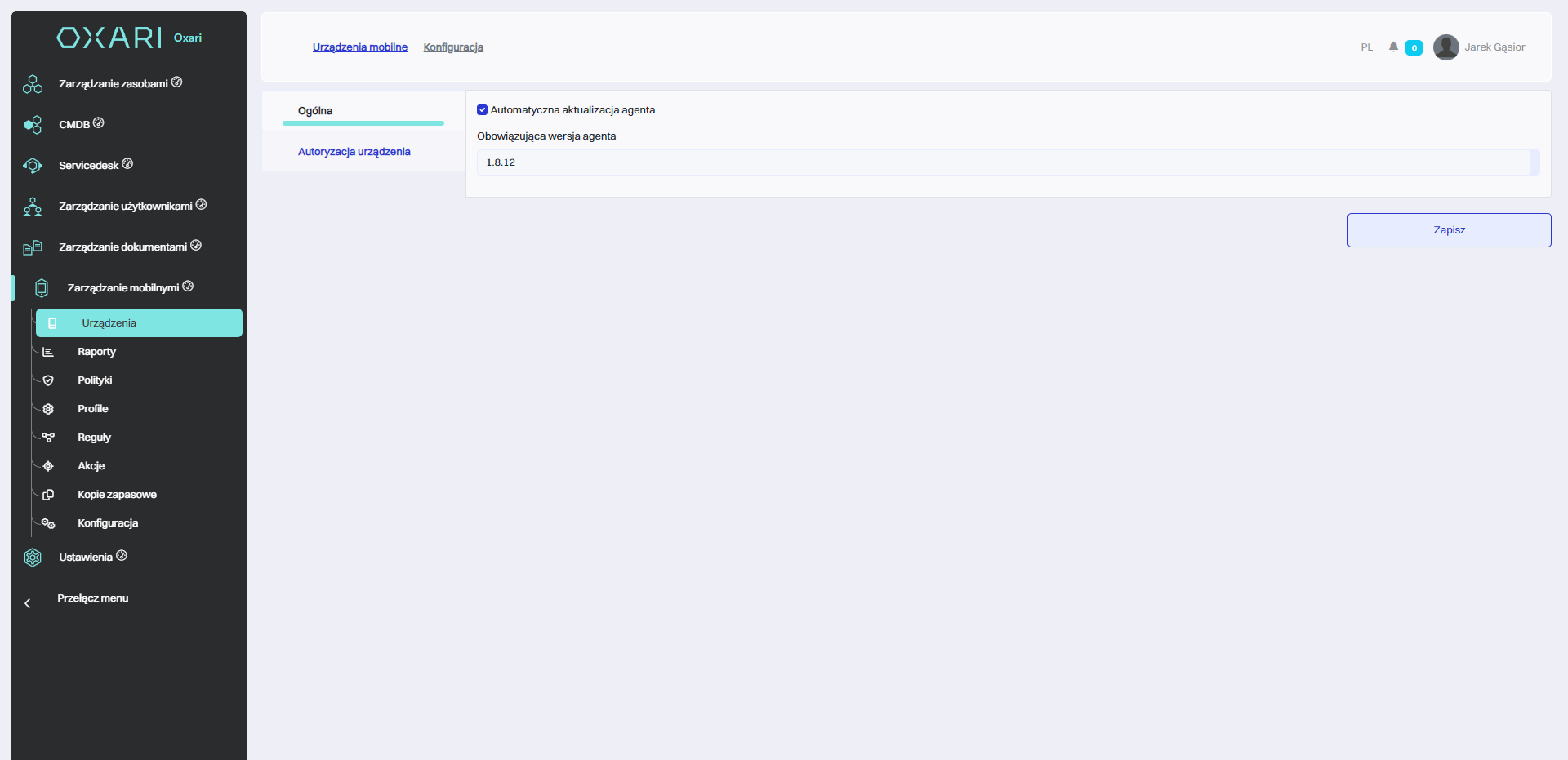 W tej zakładce można ustawić, między innymi, polityki dotyczące automatycznej aktualizacji oprogramowania agenta na urządzeniach, co zapewnia, że wszystkie urządzenia działają na aktualnych wersjach oprogramowania. Umożliwia to także ustawienie wymaganej wersji agenta, co może być ważne dla zachowania kompatybilności z korporacyjnymi standardami bezpieczeństwa i funkcjonalności.