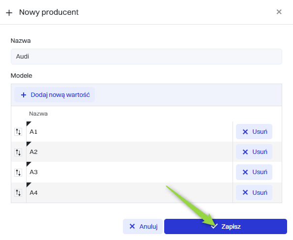 Następnie w oknie “Nowy producent” należy wpisać nazwę producenta i dodać pożądane modele, na końcu kliknąć przycisk “Zapisz”.
