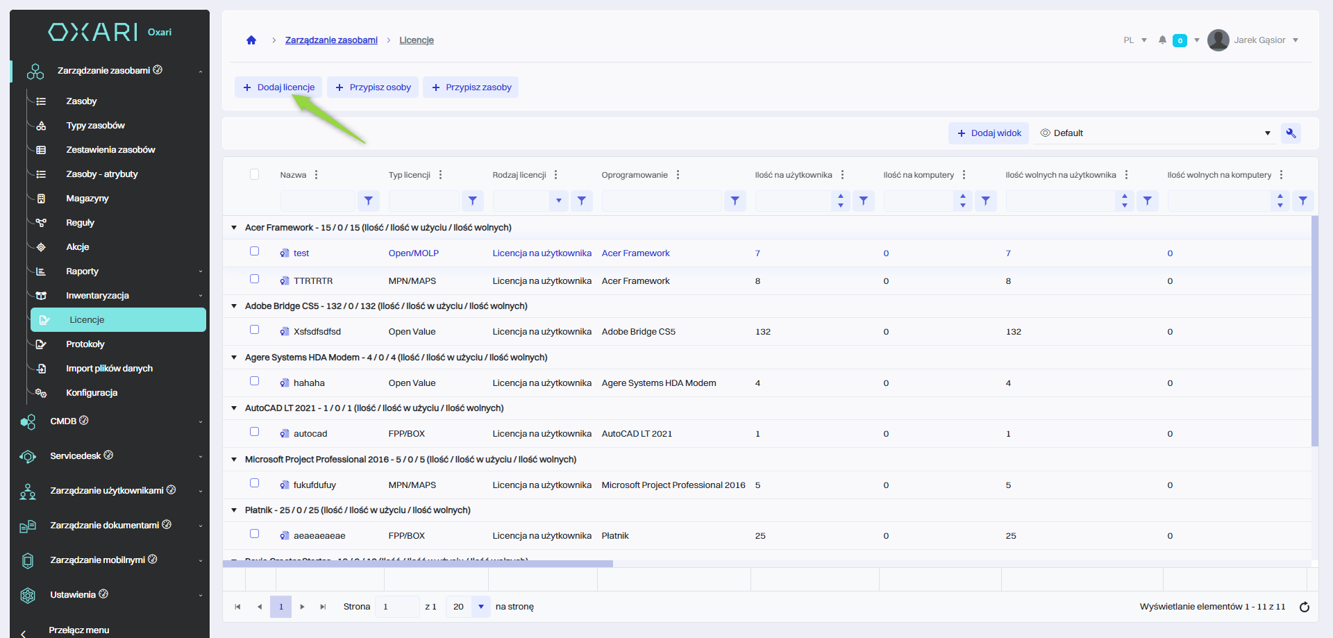 Sekcja "Licencje" umożliwia zarządzanie licencjami na oprogramowanie w organizacji. Pozwala na dodawanie nowych licencji, określanie ich typu i rodzaju, przypisywanie licencji do konkretnych zasobów oraz użytkowników, oraz monitorowanie ich wykorzystania. Użytkownik może również edytować i usuwać licencje, co jest przydatne przy aktualizacji lub zmianie oprogramowania. Funkcja ta zapewnia przestrzeganie zasad licencyjnych i ułatwia zarządzanie aktywami cyfrowymi.