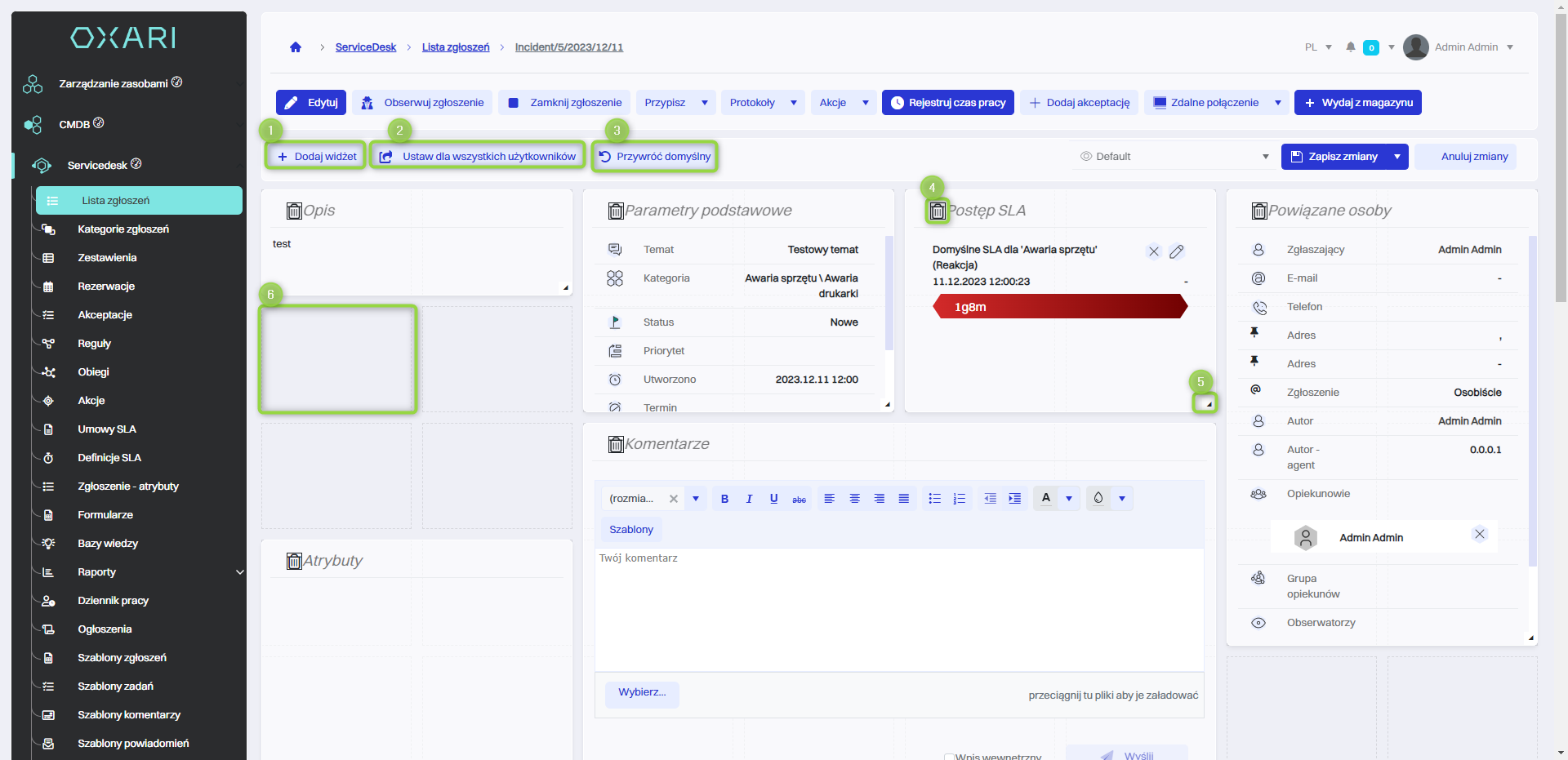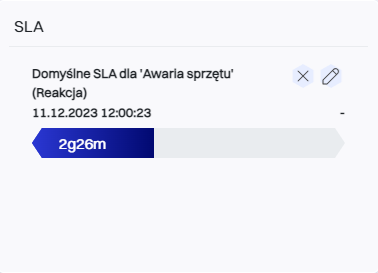 SLA (Service Level Agreement) - Blok informacyjny pokazujący, jakie zobowiązania dotyczące poziomu usług (np. czas reakcji) są powiązane z tym zgłoszeniem i ile czasu pozostało do ich realizacji.