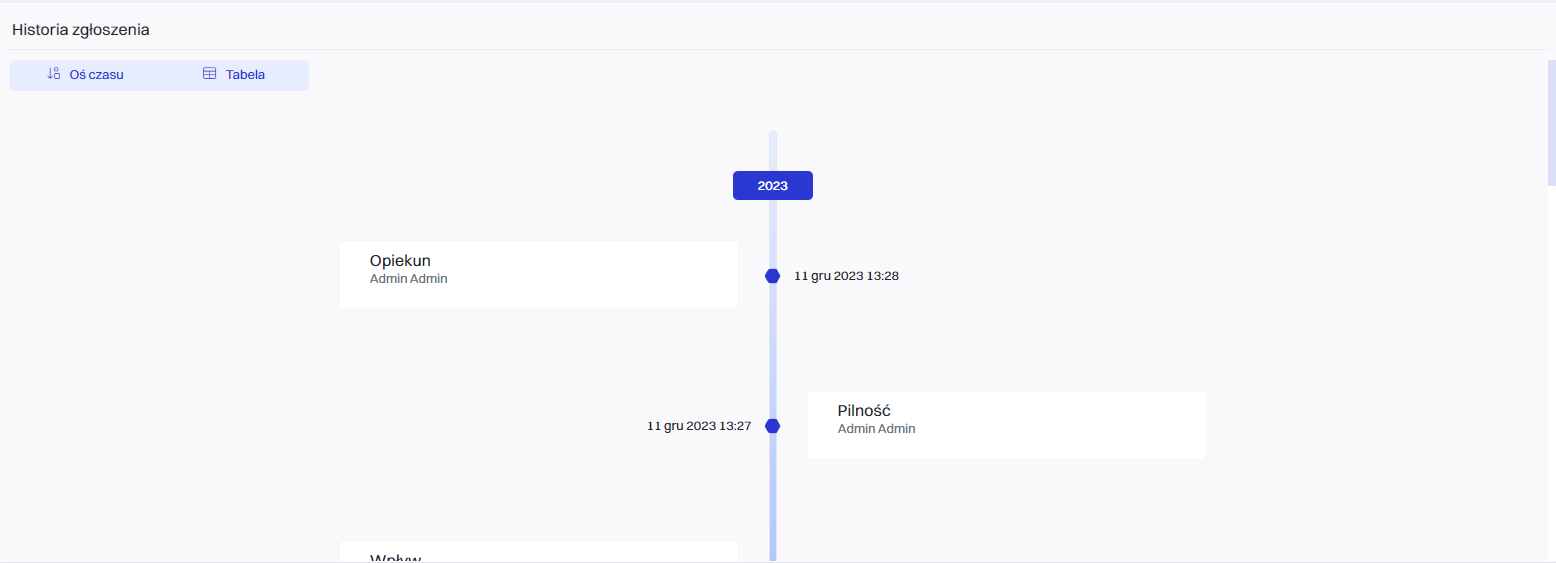 Zawiera zapis wszystkich zmian i działań wykonanych w ramach zgłoszenia, co pozwala na pełną przejrzystość i śledzenie historii przypadku.