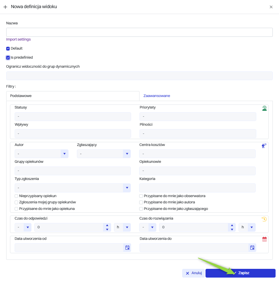 Następnie w oknie “Nowa definicja widoku” można spersonalizować widok listy zgłoszeń, poniżej opisane najważniejsze opcje: