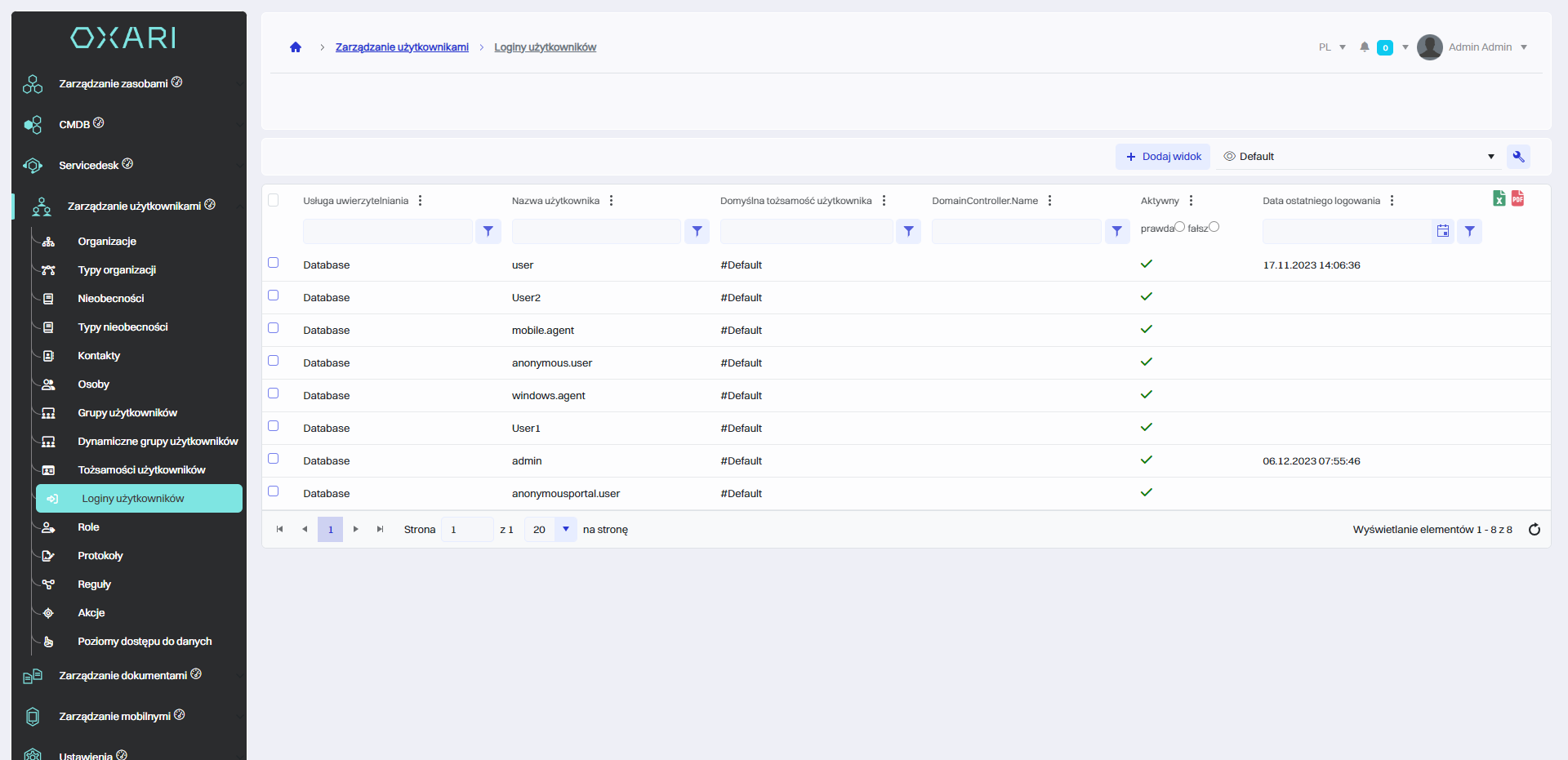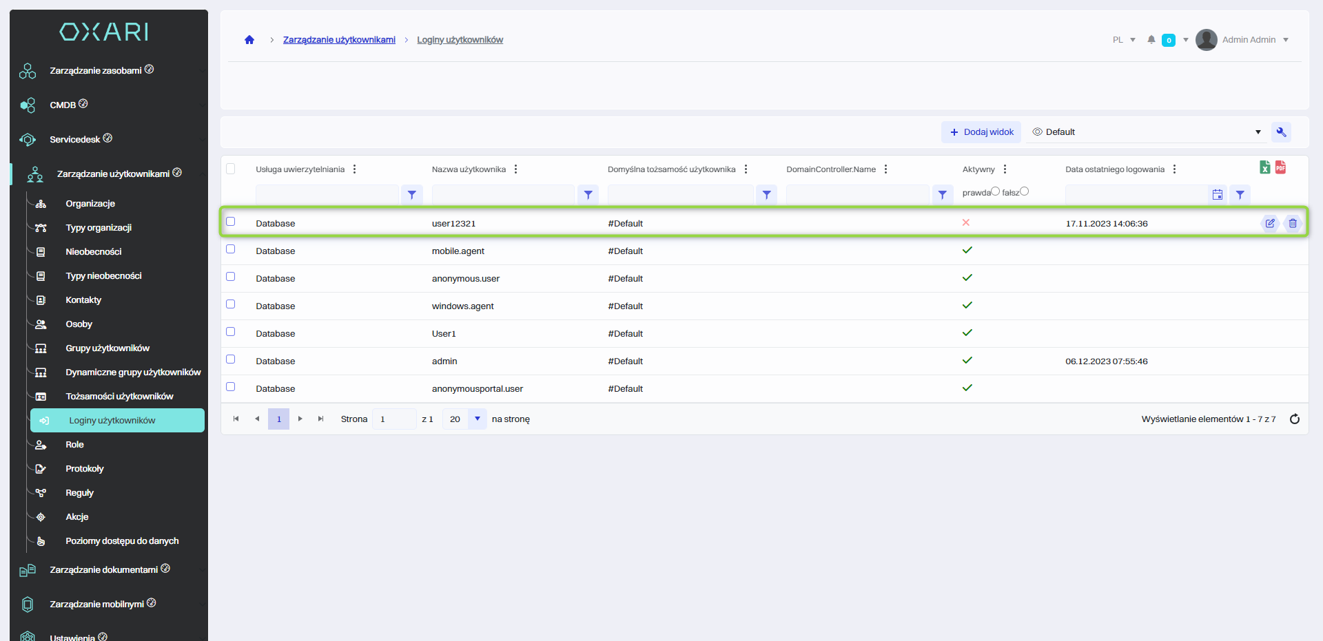 Sekcja "Loginy użytkowników" pokazuje listę kont użytkowników wraz z ich loginami, domyślnymi tożsamościami, aktywnością i datami ostatniego logowania. Login użytkownika, który jest unikalnym identyfikatorem, jest tworzony w momencie zakładania nowej osoby w systemie. Każdy login jest powiązany z tożsamością. Kolumna "Aktywny" zaznaczona znakiem "✔" wskazuje, czy konto jest aktualnie aktywne. Kolumna “Data ostatniego” logowania dostarcza informacje o ostatniej aktywności użytkownika w systemie.