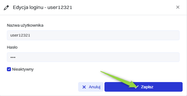 | 3 | Nieaktywny - Checkbox, który po zaznaczeniu oznacza, że konto użytkownika jest nieaktywne. Nieaktywne konta nie mają dostępu do systemu. |