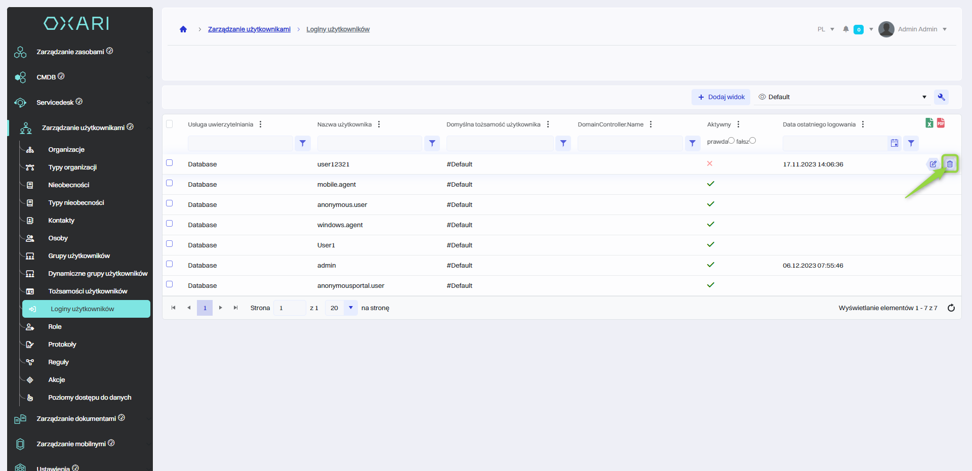 W celu usunięcia loginu należy przejść do sekcji Zarządzanie użytkownikami > Loginy użytkowników, a następnie użyć przycisku “Edytuj” przy pożądanym loginie.