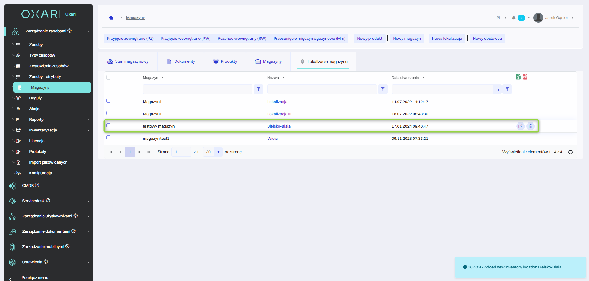 W celu dodania nowej lokalizacji należy przejść do sekcji Zarządzanie zasobami > Magazyny, a następnie kliknąć przycisk “Nowa lokalizacja”.