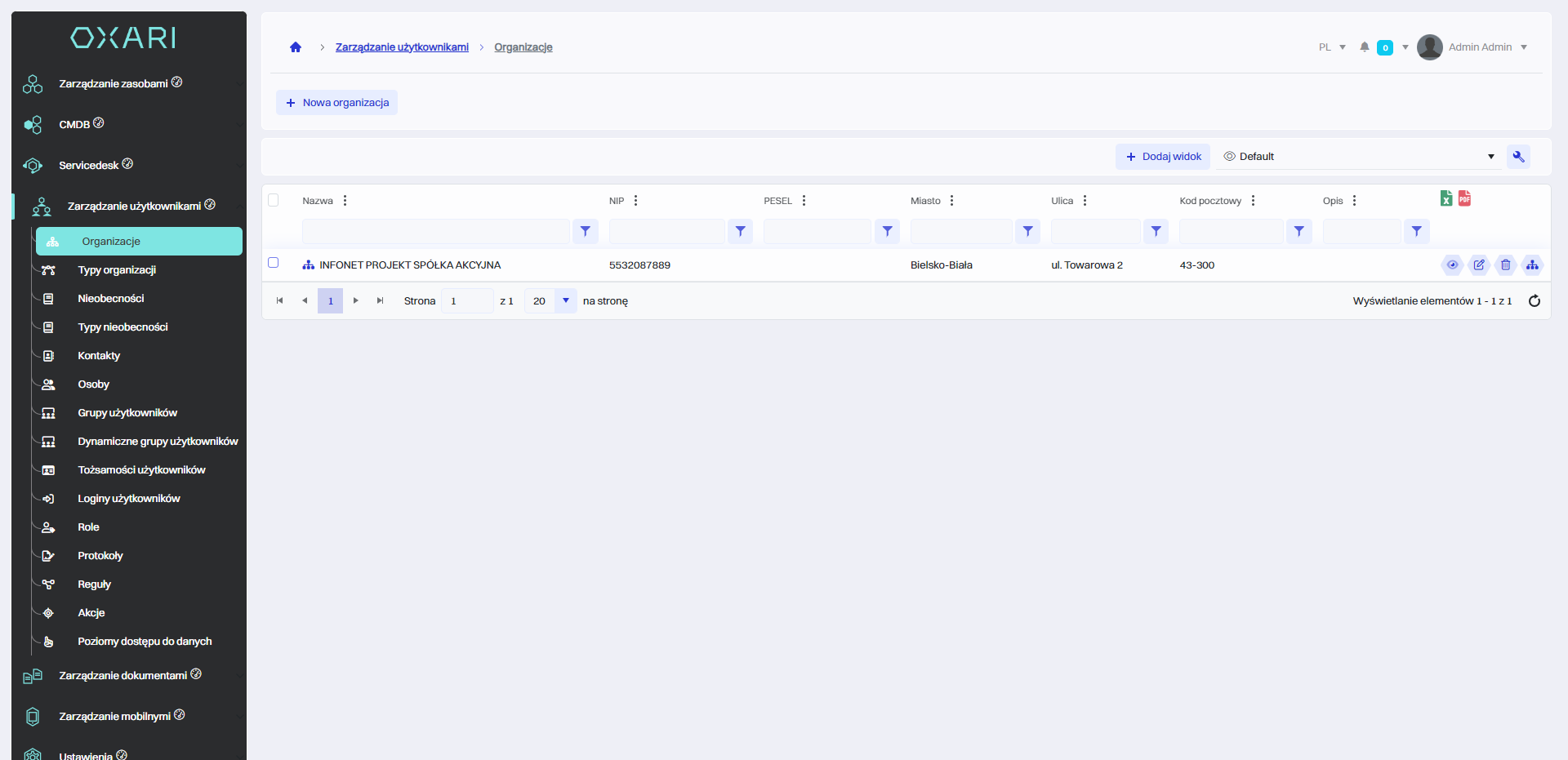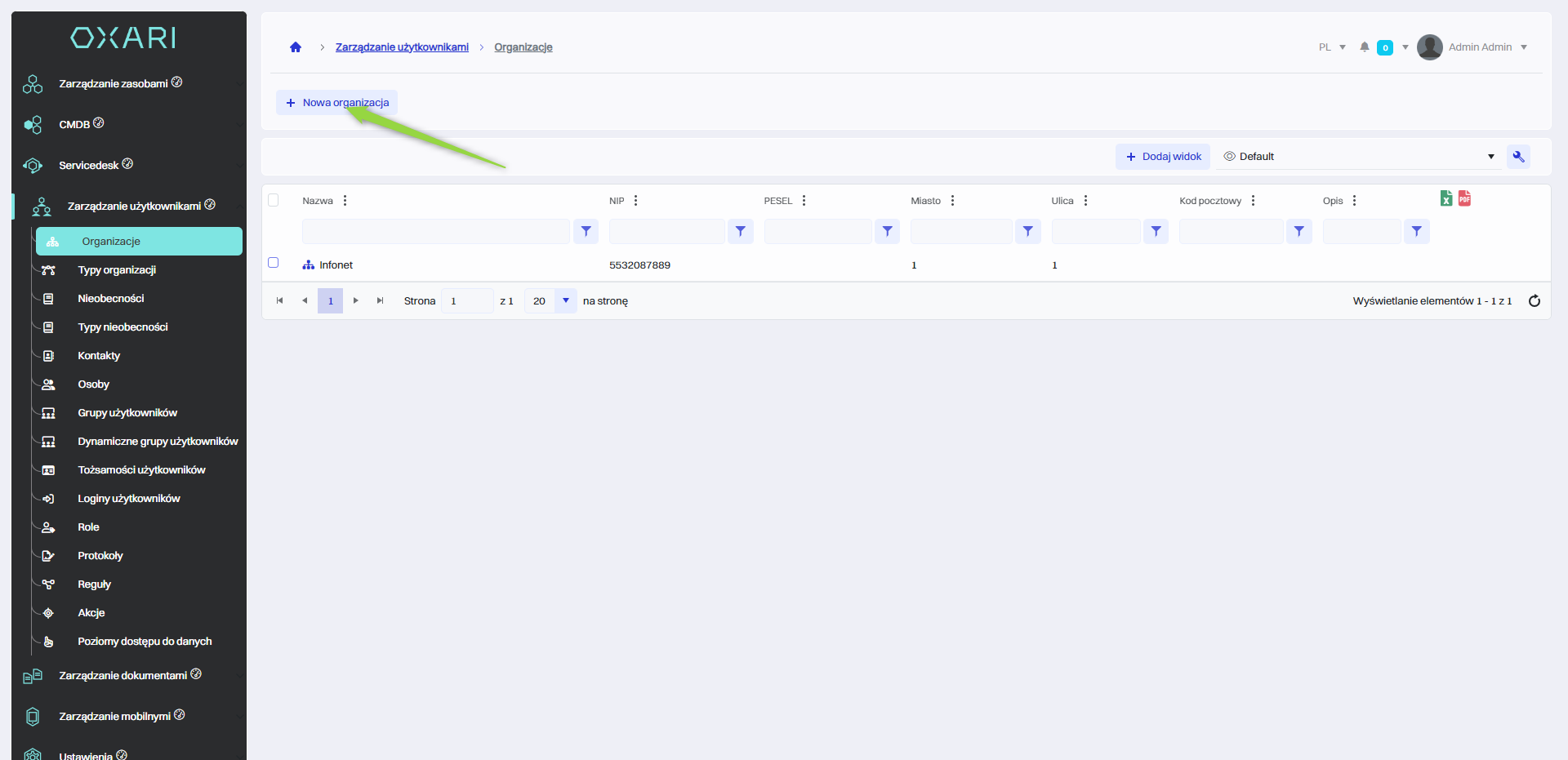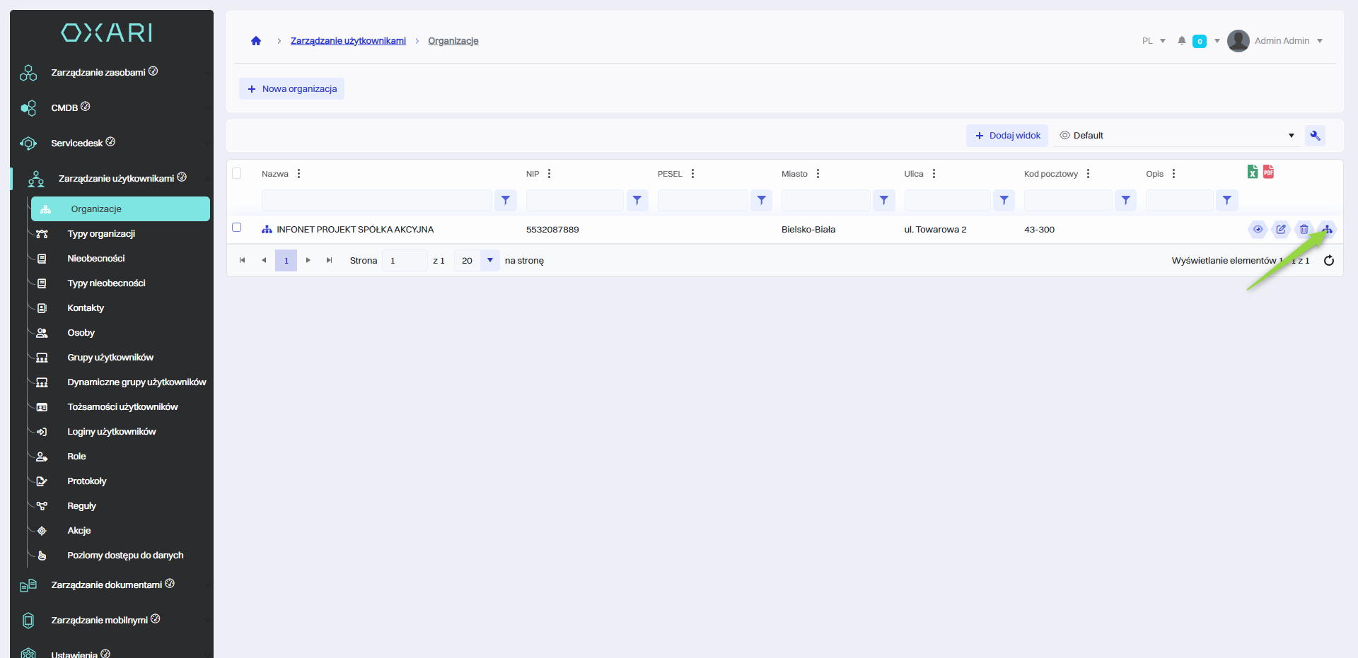 W celu dodania nowej organizacji należy przejść do sekcji Zarządzanie użytkownikami > Organizacje, a następnie kliknąć przycisk “Nowa organizacja”.
