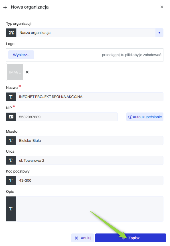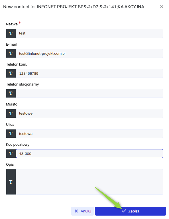 W tym kroku należy wypełnić dane do pożądanego kontaktu pod daną organizację, a następnie kliknąć przycisk “Zapisz”.