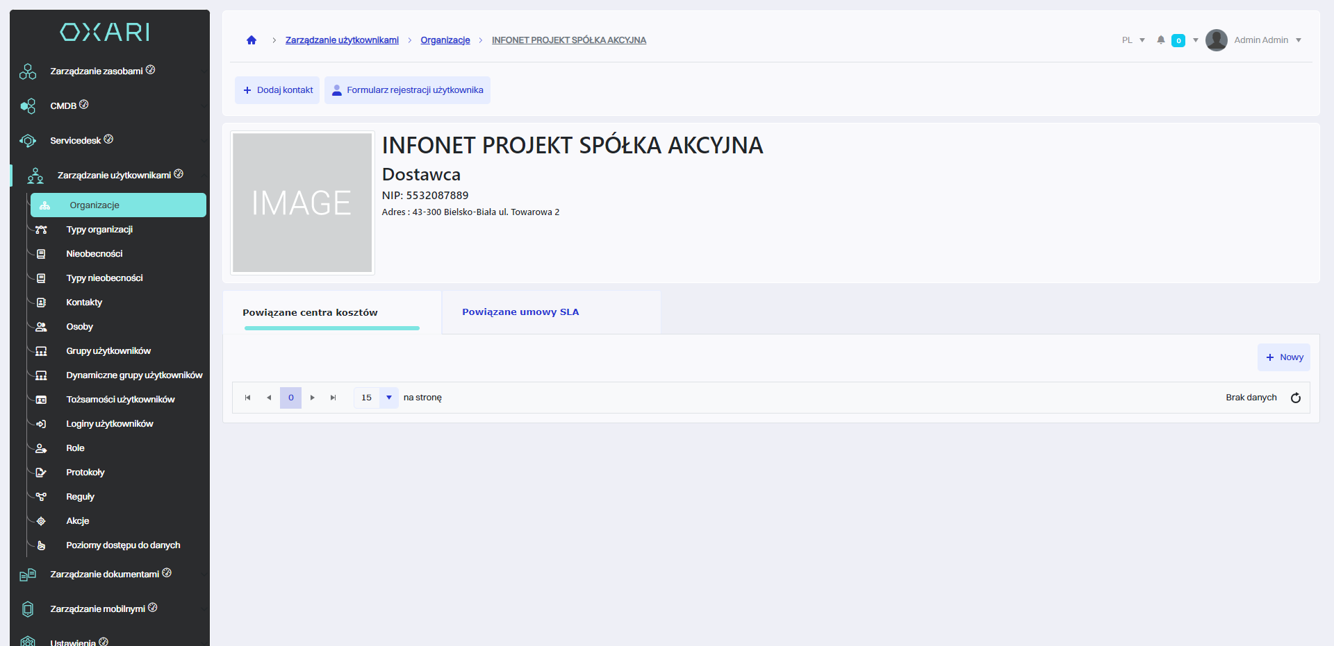 Sekcja "Organizacje" umożliwia tworzenie i zarządzanie strukturami organizacyjnymi i lokalizacyjnymi, przypisywanie kontaktów, śledzenie finansów poprzez centra kosztów, zarządzanie umowami SLA oraz klasyfikację organizacji według typów, co wspiera efektywną koordynację i zarządzanie wewnątrz organizacji oraz w relacjach zewnętrznych.