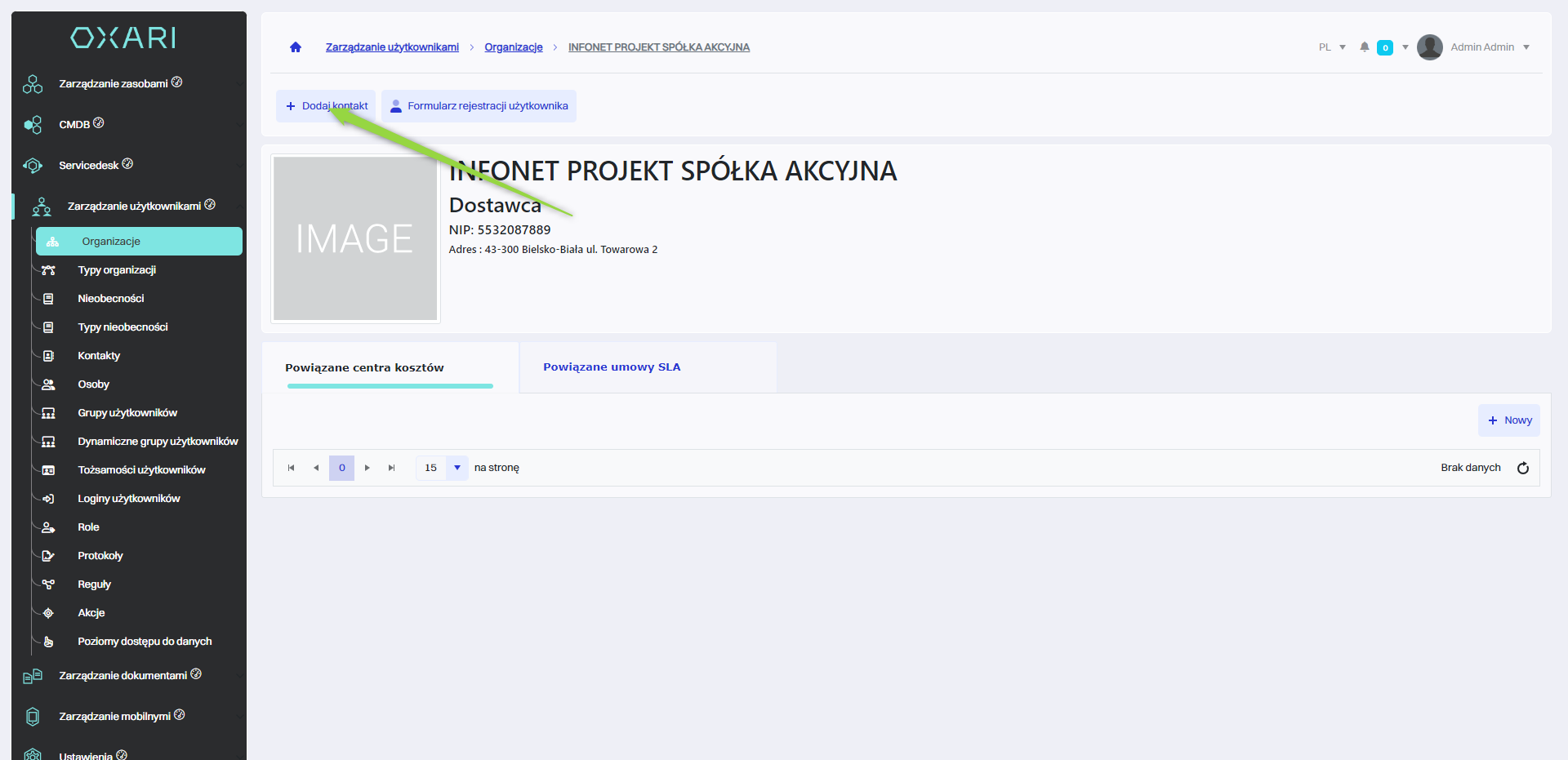 | 1 | Dodaj kontakt - Pozwala na dodanie nowych informacji kontaktowych do profilu organizacji. Więcej o kontaktach: Przejdź > |