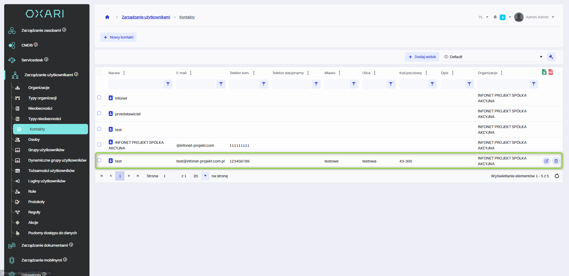 Kontakt został zapisany, widnieje w sekcji Zarządzanie użytkownikami > Kontakty.