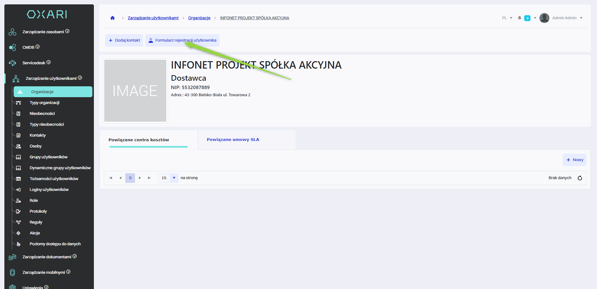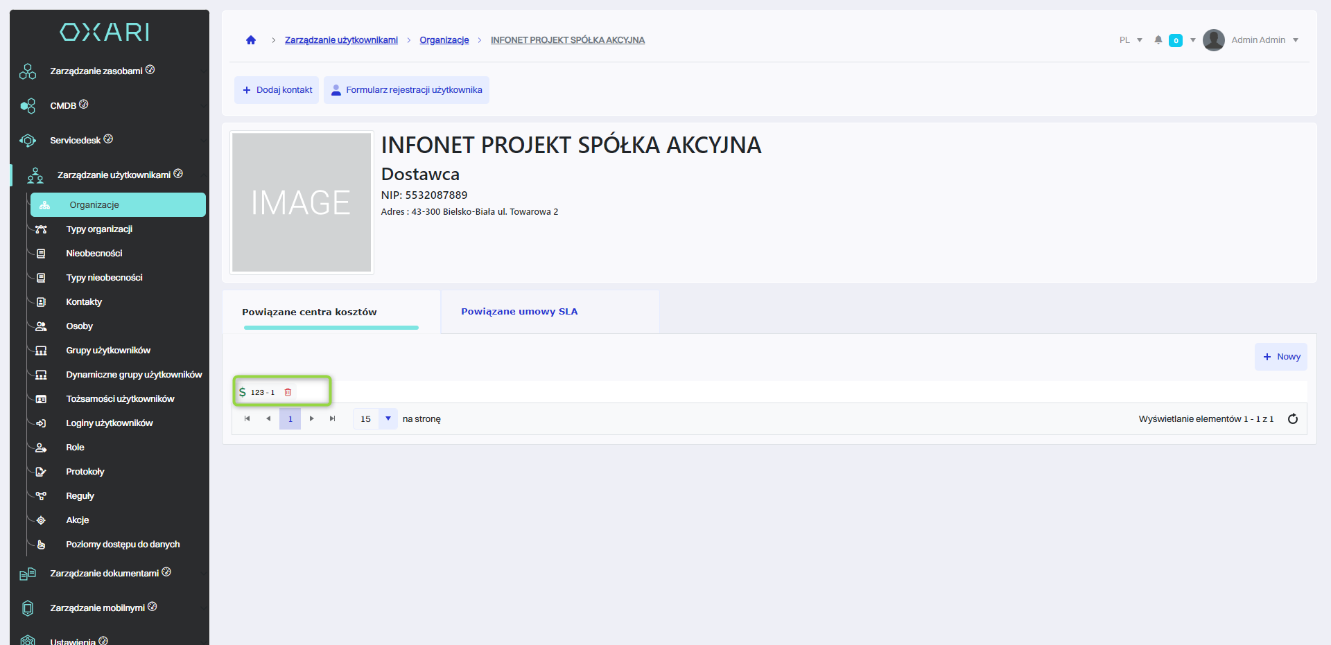 Umowa SLA zostaje powiązana z organizacją.