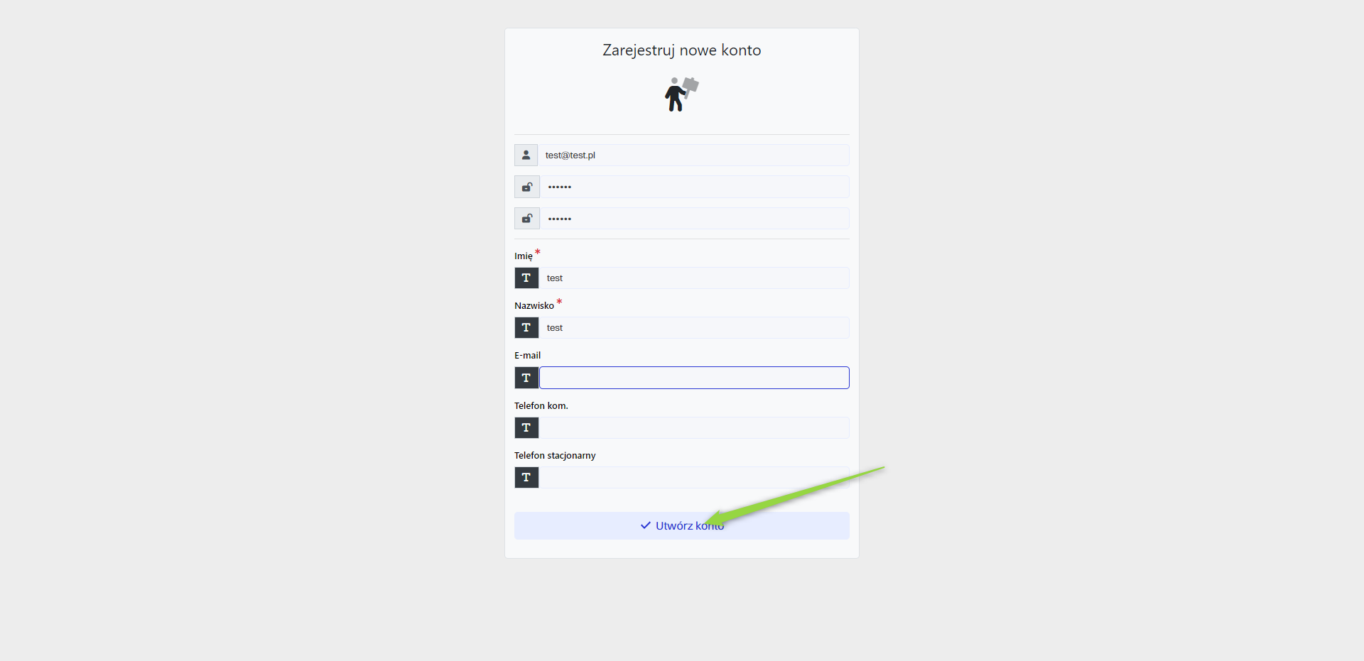 Następnie w oknie “Zarejestruj nowe konto” należy wypełnić wymagane pola i kliknąć przycisk “Utwórz konto”.