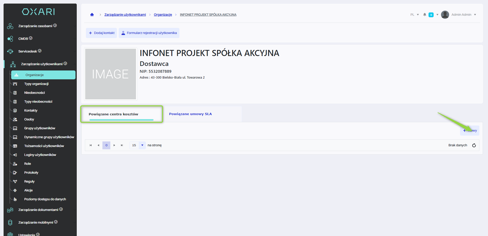 W celu powiązania centrum kosztów z organizacją należy w zakładce “Powiązane centrum kosztów” kliknąć przycisk “Nowy”.
