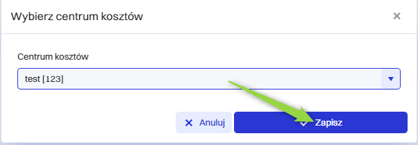 Następnie w oknie “Wybierz centrum kosztów” wybrać pożądane centrum kosztów i kliknąć przycisk “Zapisz”.
