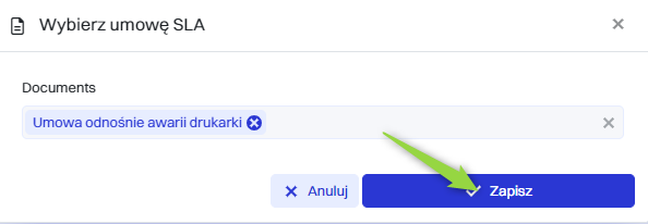 Następnie w oknie “Wybierz umowę SLA” wybrać pożądaną umowę SLA i kliknąć przycisk “Zapisz”.