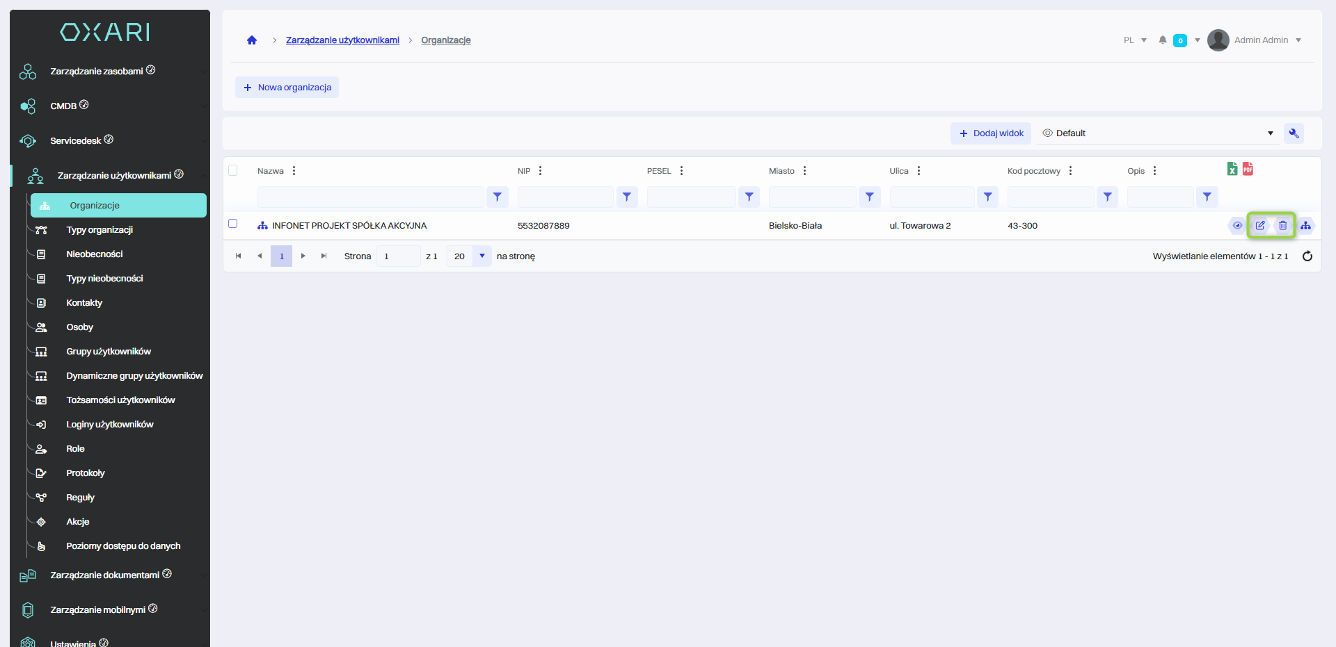 Aby edytować lub usuwać organizacje, należy przejść do sekcji Zarządzanie użytkownikami > Organizacje. Najechać na pożądaną organizacje. Wyświetlą się przyciski do edytowania/usuwania.