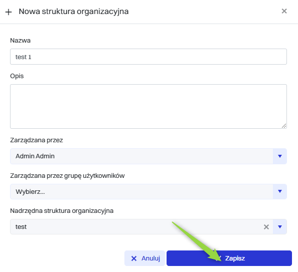 | 2 | Opis - W tym polu można dostarczyć dodatkowe informacje opisujące strukturę organizacyjną, jej funkcje, zakres odpowiedzialności lub inne relewantne szczegóły. |