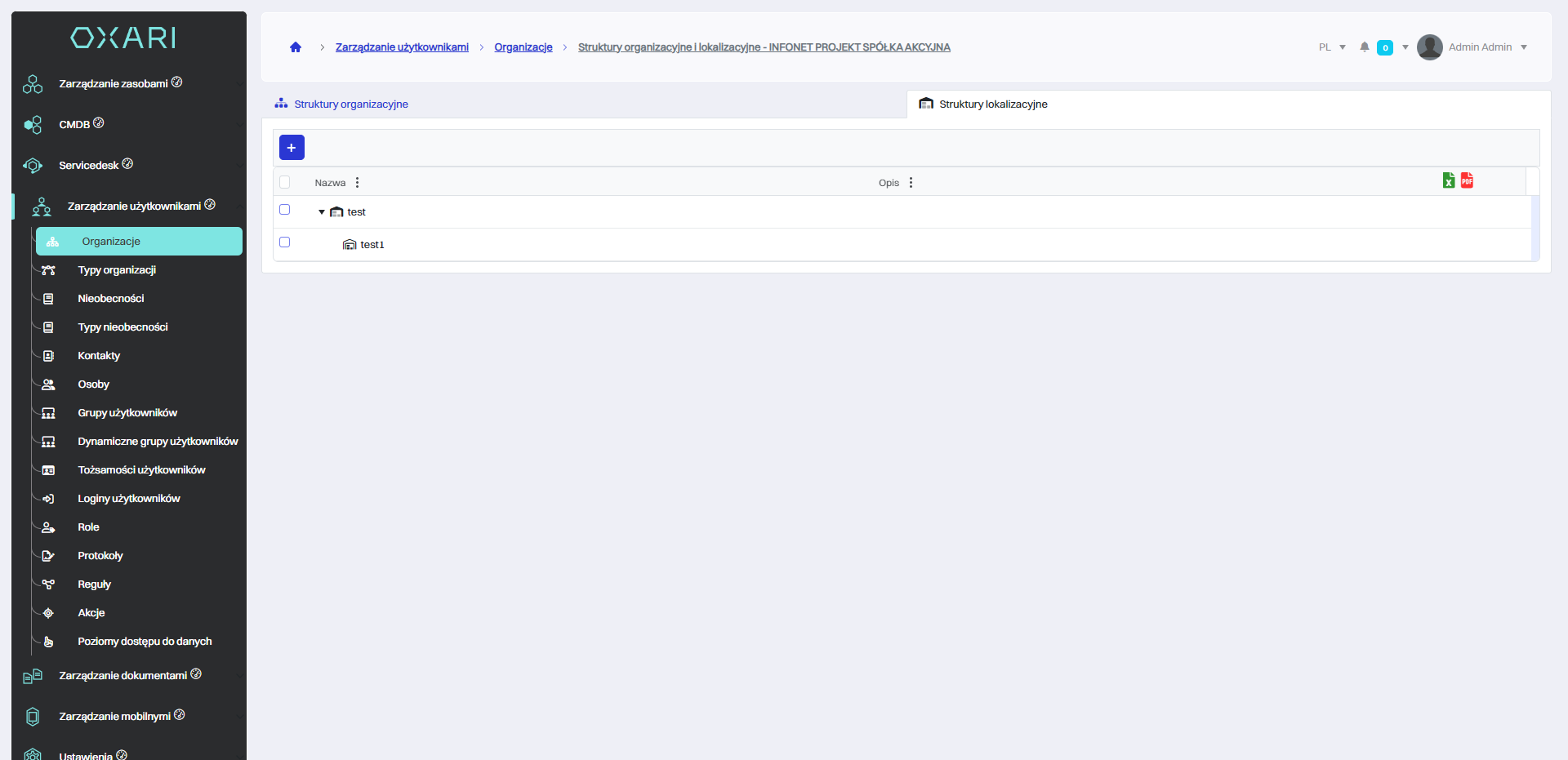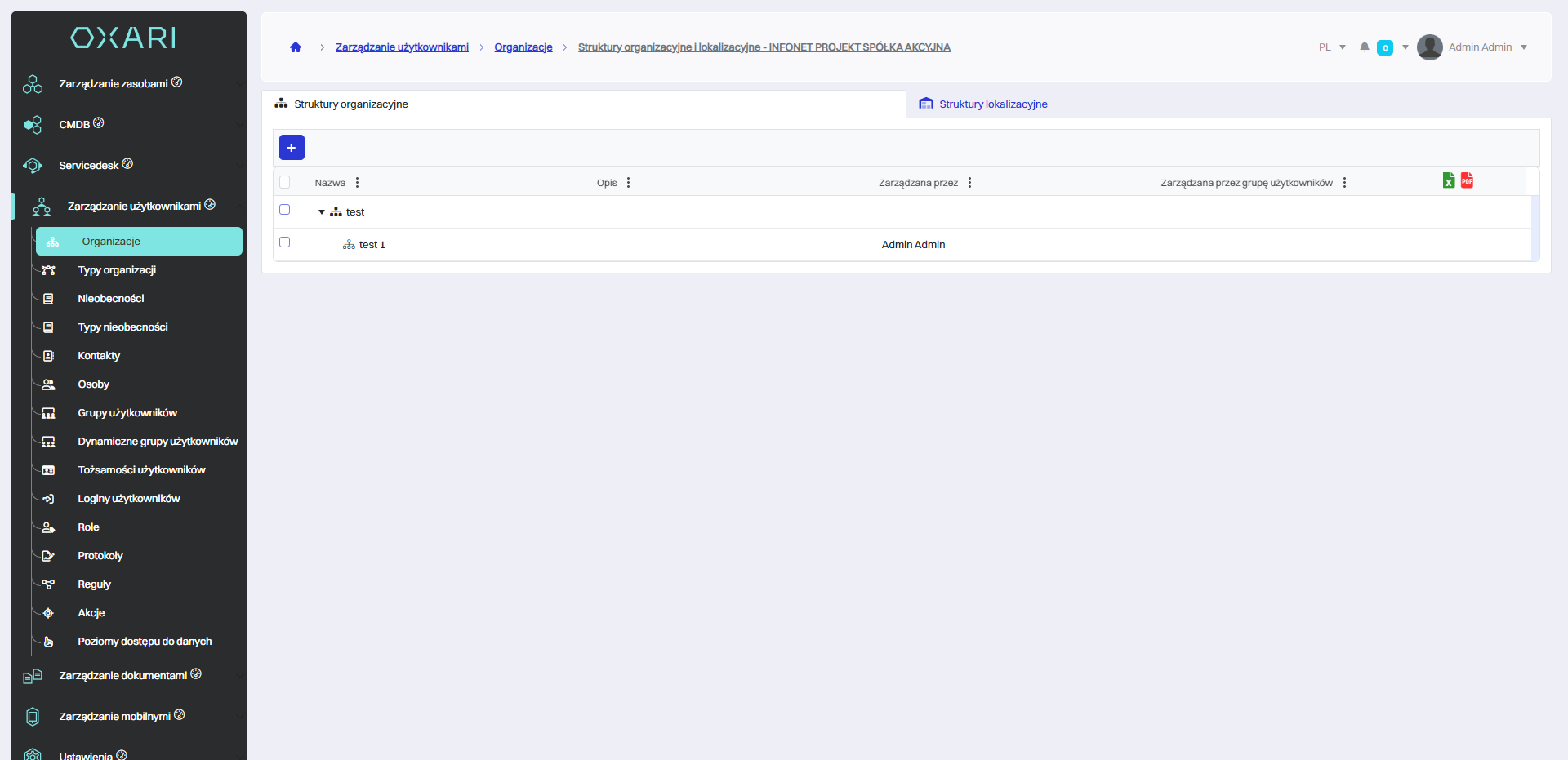 Aby ręcznie dodać struktury organizacyjne należy kliknąć przycisk “+” w zakładce “Struktury organizacyjne”.