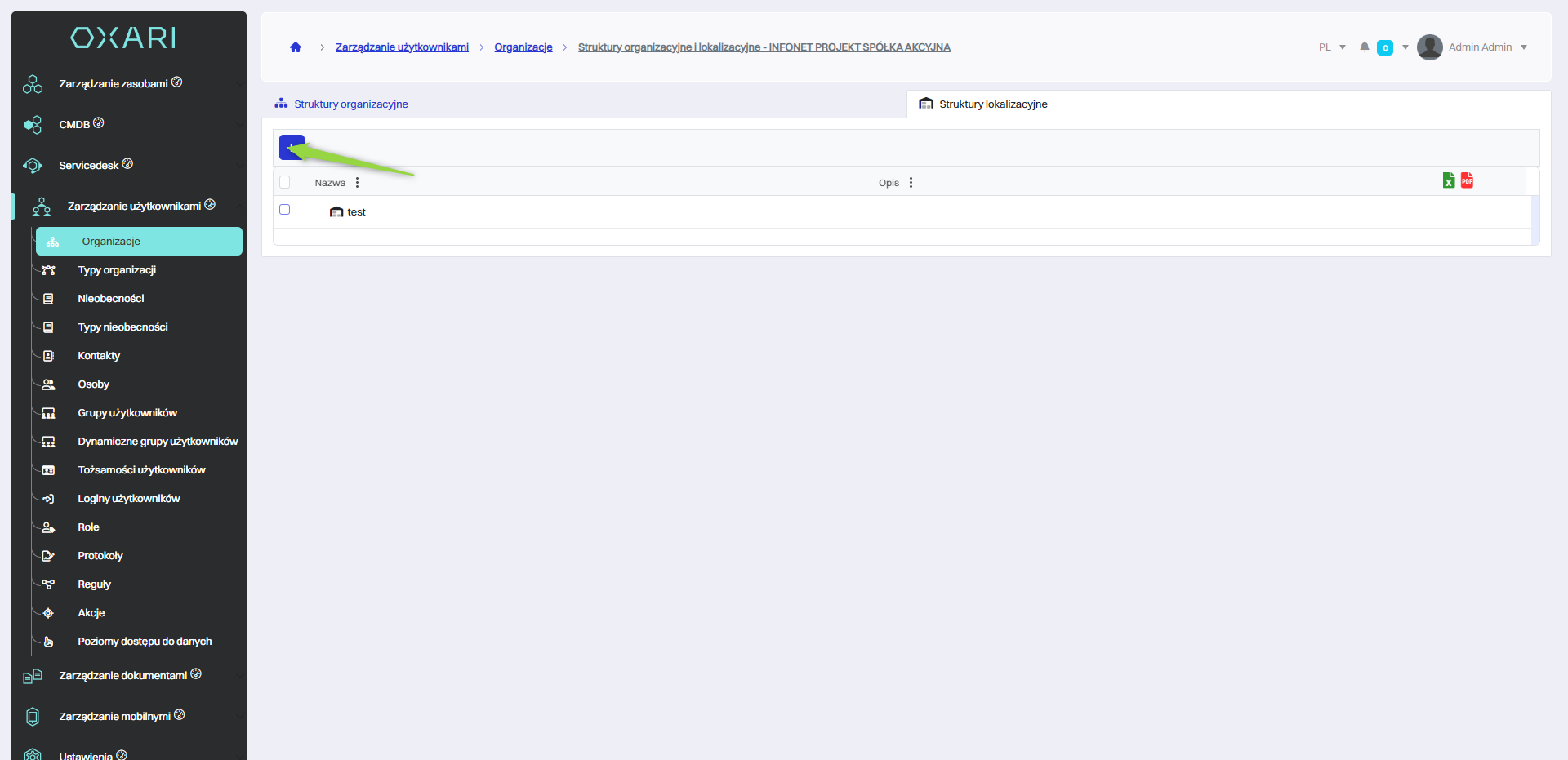 Aby ręcznie dodać struktury lokalizacyjne należy kliknąć przycisk “+” w zakładce “Struktury lokalizacyjne”.
