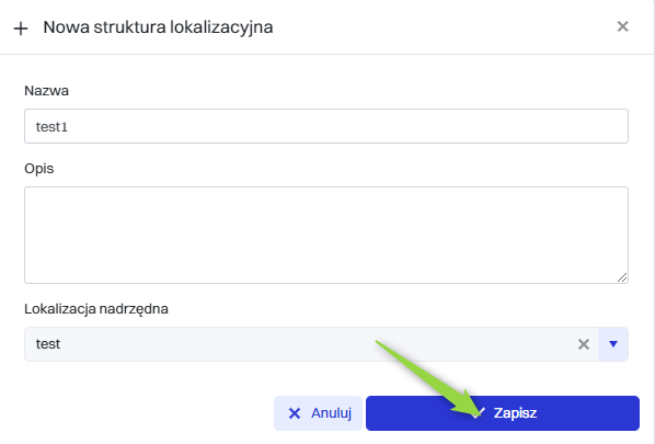 | 3 | Lokalizacja nadrzędna - Menu rozwijane pozwala wybrać istniejącą strukturę lokalizacyjną, pod którą nowa struktura będzie podporządkowana. To pozwala na utworzenie hierarchicznej organizacji lokalizacji. |