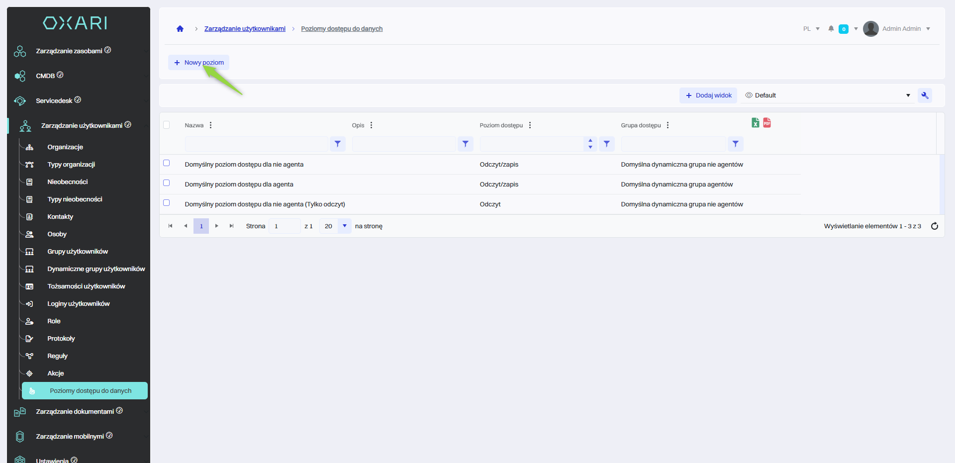 W celu dodania nowego poziomu dostęp należy przejść do sekcji Zarządzanie użytkownikami > Poziomy dostępu do danych, a następnie kliknąć przycisk “Nowy poziom”.