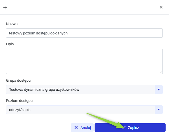 | 4 | Poziom dostępu - W tym miejscu wybiera się, czy użytkownicy z wybranej grupy będą mieli uprawnienia do "odczytu" danych, czy "odczytu/zapisu". To decyduje o tym, czy mogą oni tylko przeglądać dane, czy też mogą je również modyfikować. |