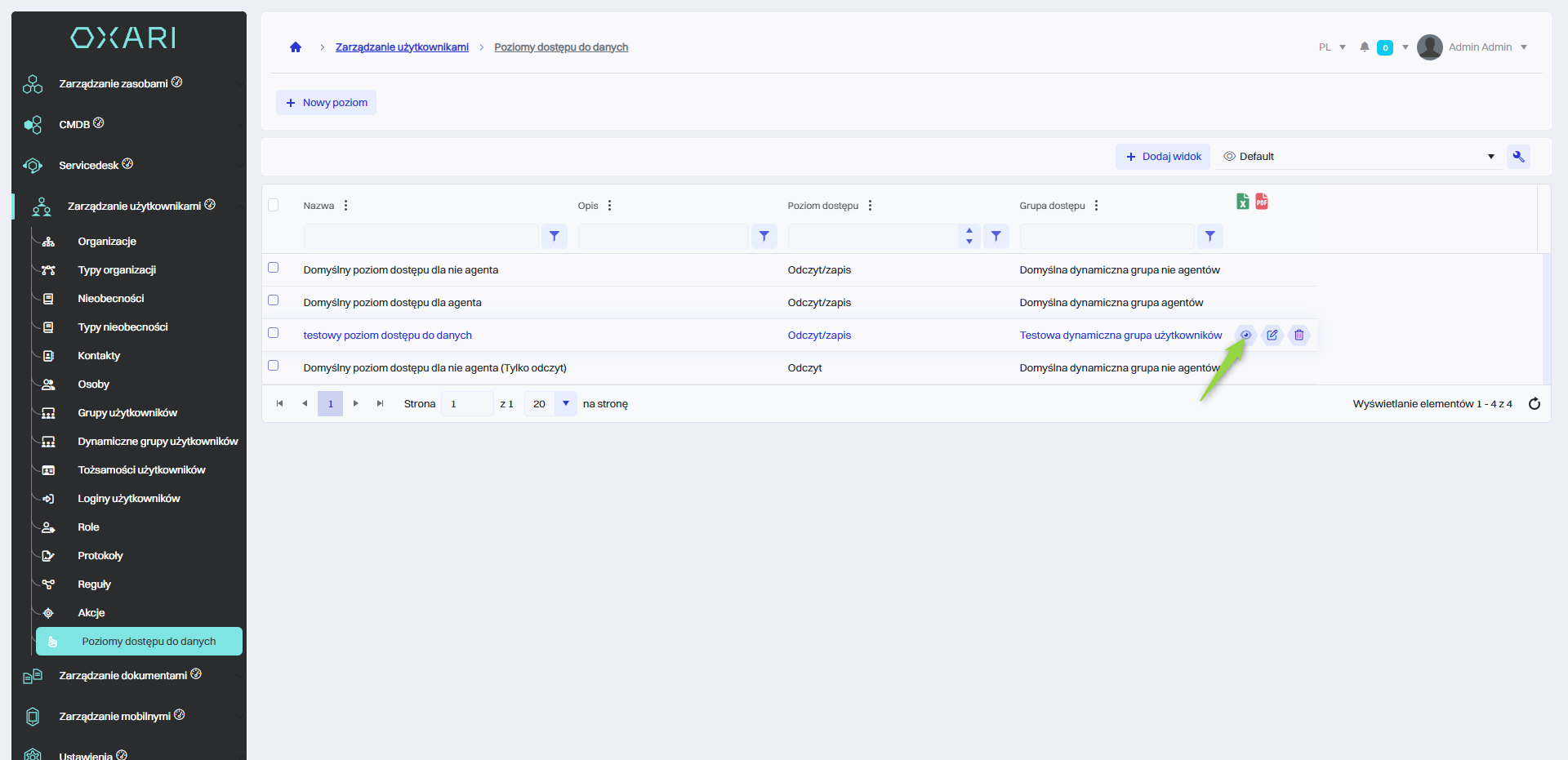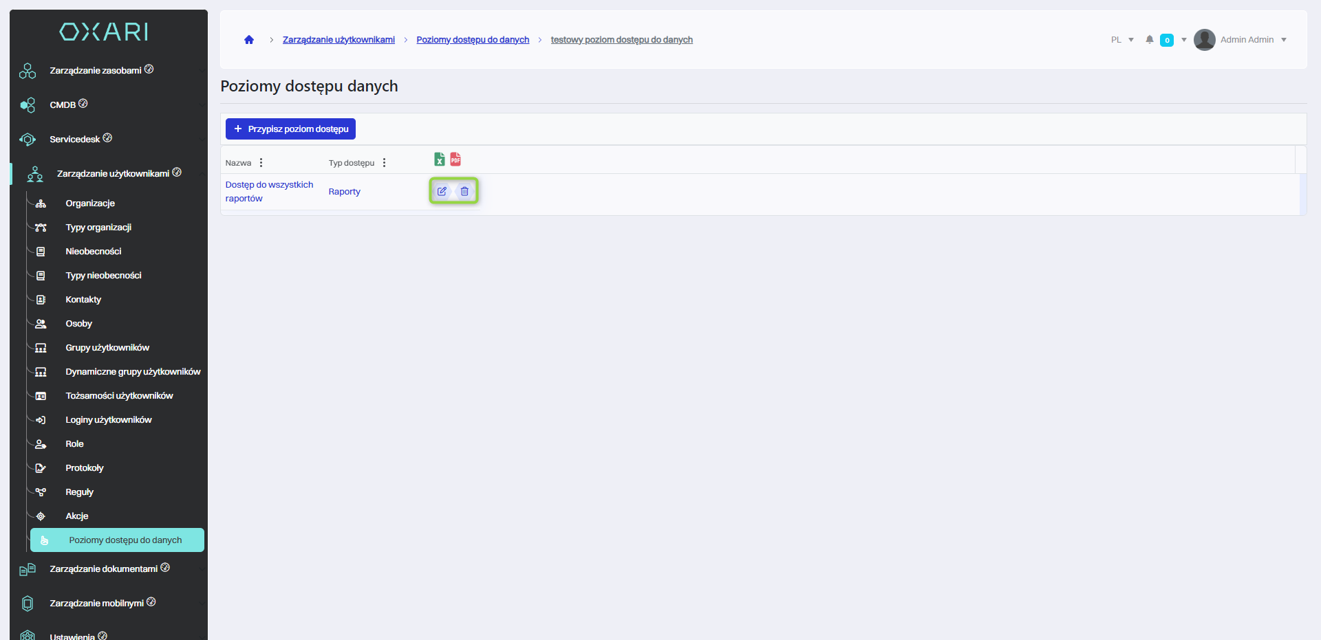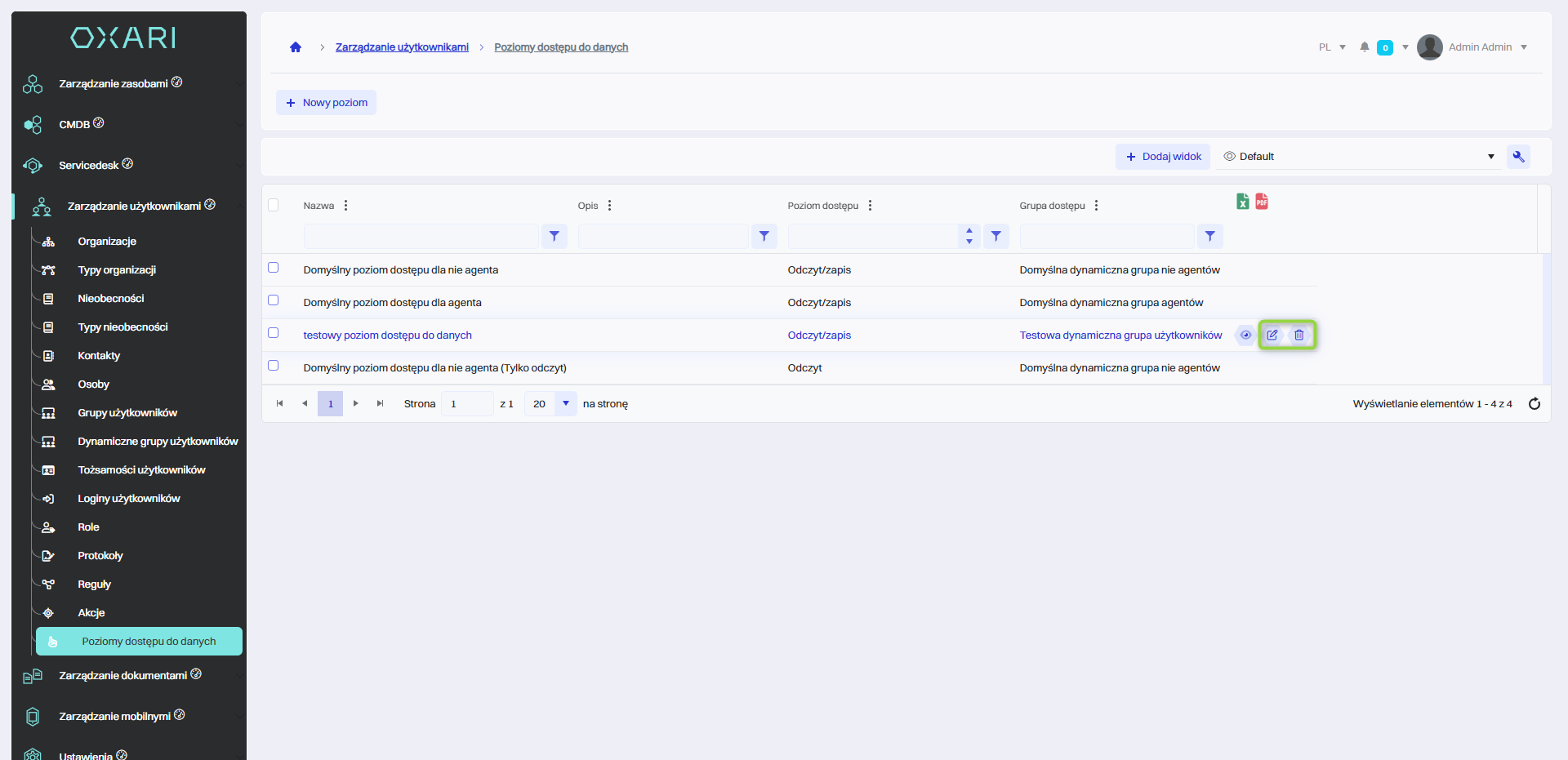 Aby edytować lub usuwać poziom dostępu, należy przejść do sekcji Zarządzanie użytkownikami > Poziomy dostępu do danych. Wejść w widok szczegółowy pożądanego poziomu dostępu do danych. Najechać na pożądany poziom dostępu. Wyświetlą się przyciski do edytowania/usuwania.