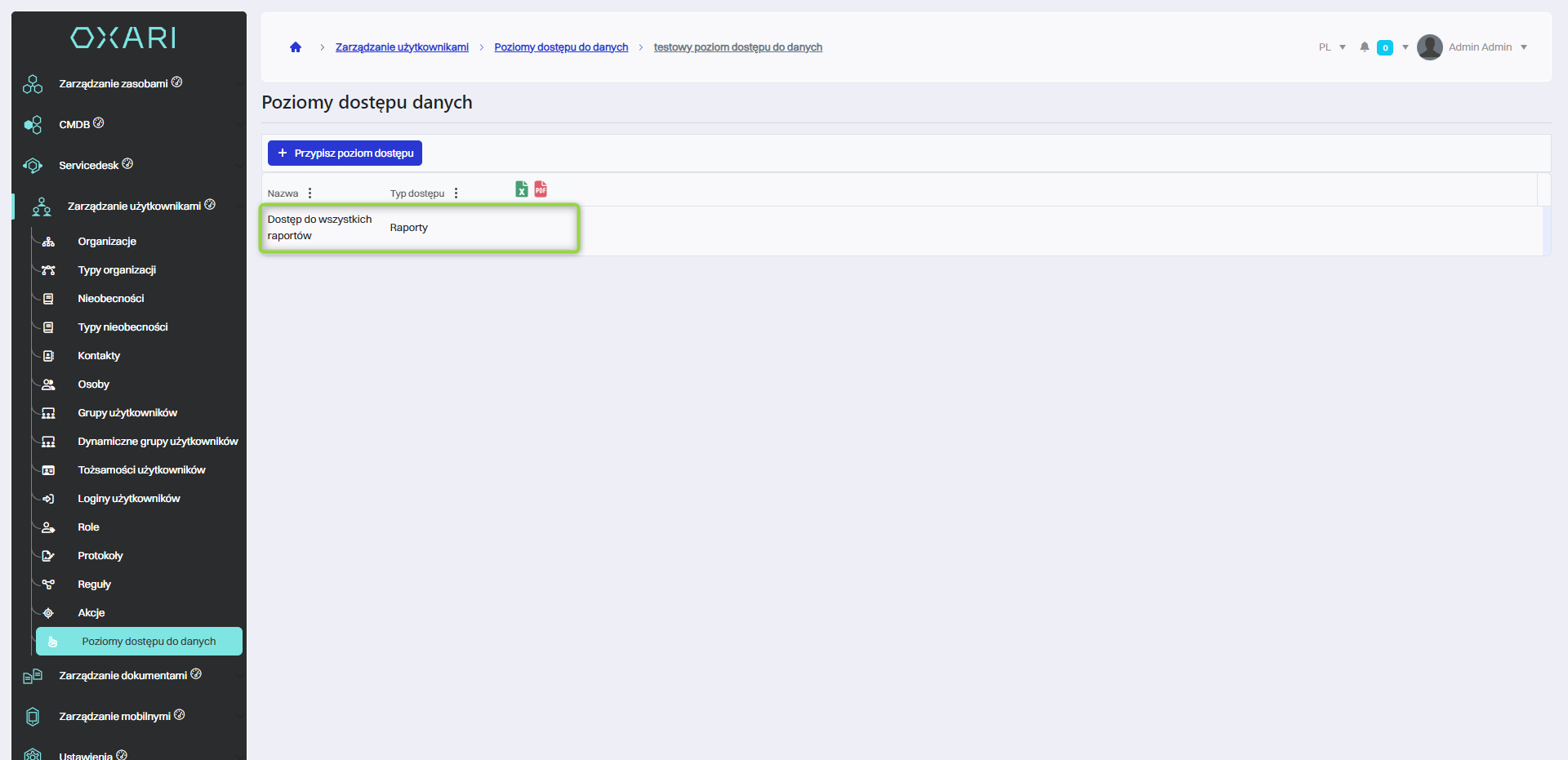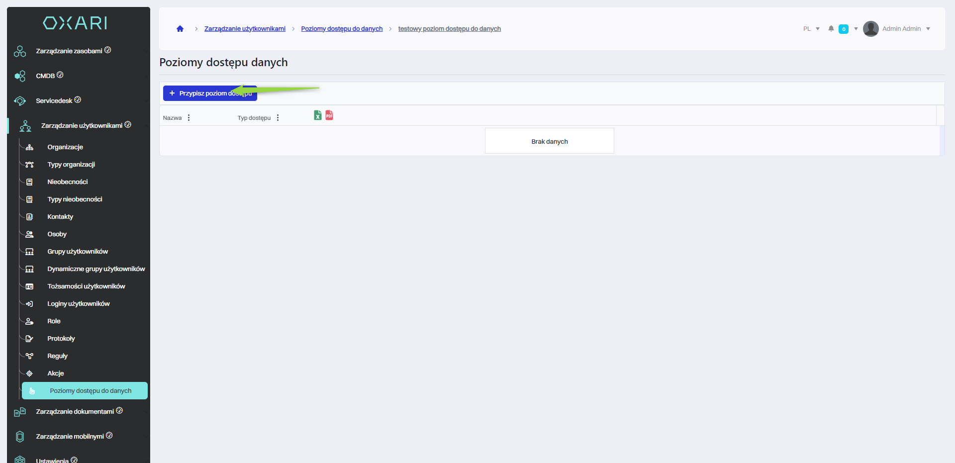 W celu przypisania poziomu dostępu, należy wejść do sekcji Zarządzanie użytkownikami > Poziomy dostępu do danych, a następnie wejść w widok szczegółowy pożądanego poziomu dostępu do danych.