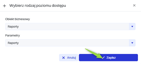 Wybieramy Obiekt biznesowy “Raporty” oraz Parametry z listy “Raporty”. Następnie klikamy “Zapisz”.