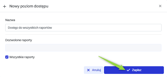 W tym kroku w oknie “Nowy poziom dostępu” należy nazwać dany poziom dostępu oraz wybrać pożądane opcje, np. dostęp do wszystkich raportów. Na końcu kliknąć przycisk “Zapisz”.