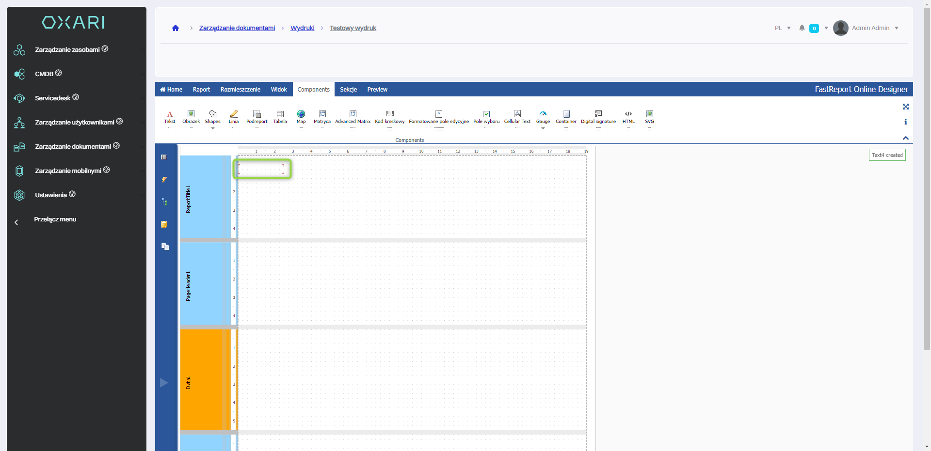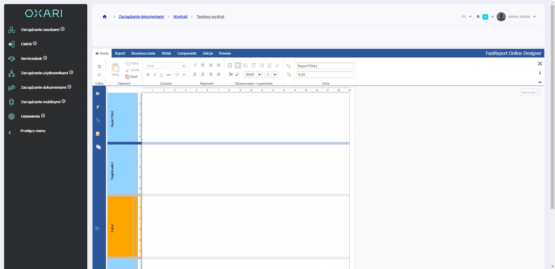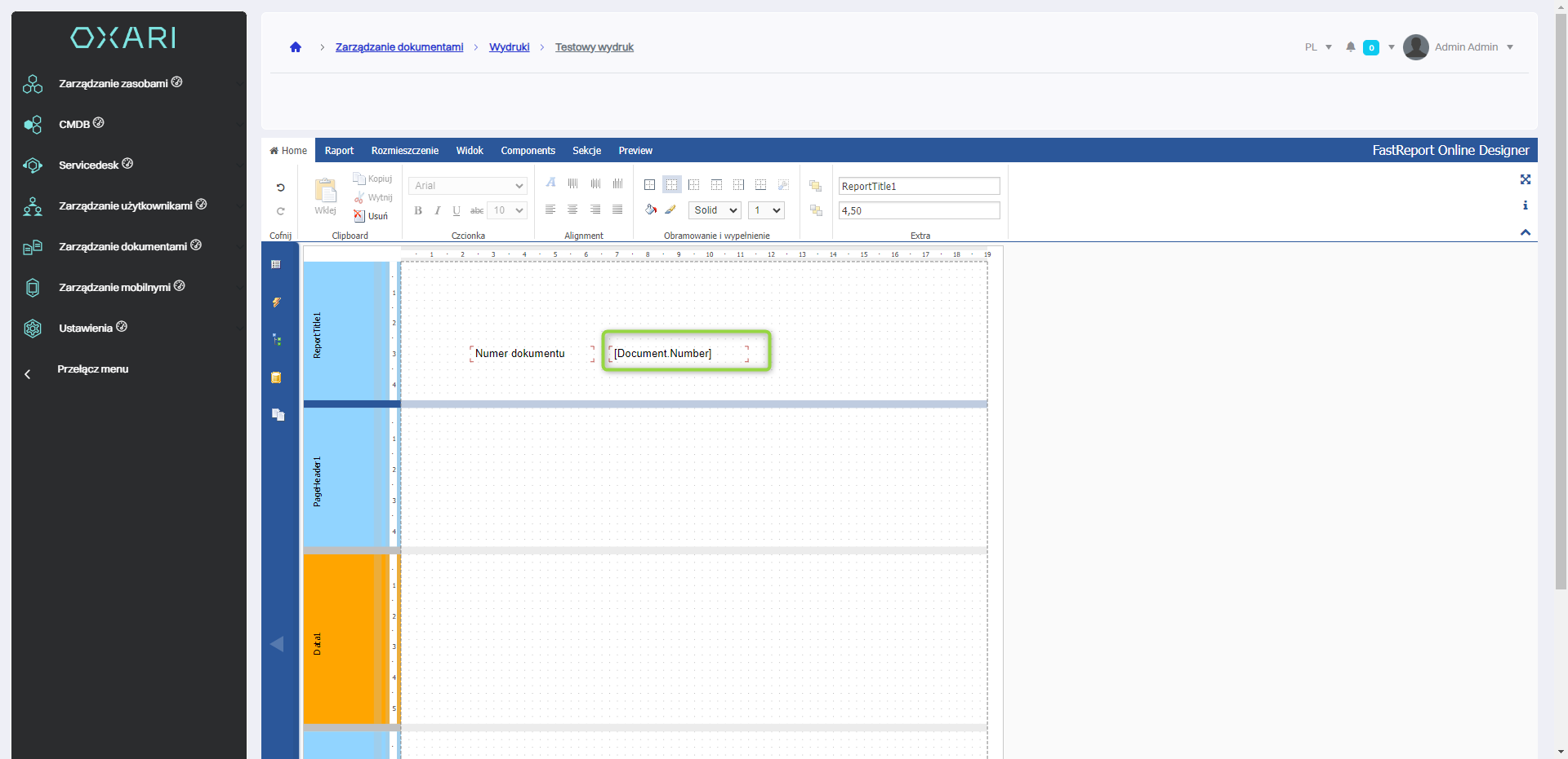 W tym kroku użytkownik jest przeniesiony do konfiguratora “FastReport Online Designer”, ma możliwość dodawania komponentów, dodawania atrybutów z sekcji Zarządzanie dokumentami > Atrybuty. Pozwala na projektowanie szablonów wydruków, które mogą zawierać różnorodne atrybuty zgromadzone w formularzach.