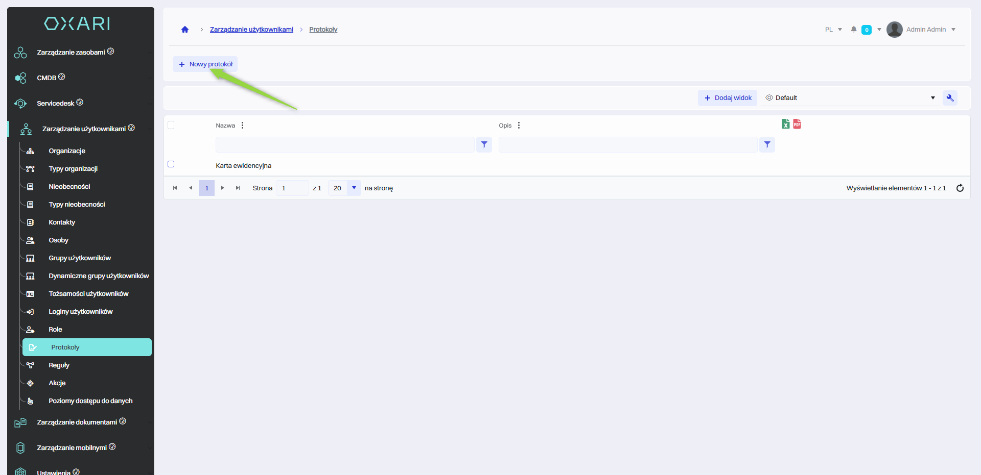 Aby dodać nowy protokół, należy przejść do sekcji Zarządzanie dokumentami > Protokoły a następnie kliknąć przycisk “Nowy protokół”.