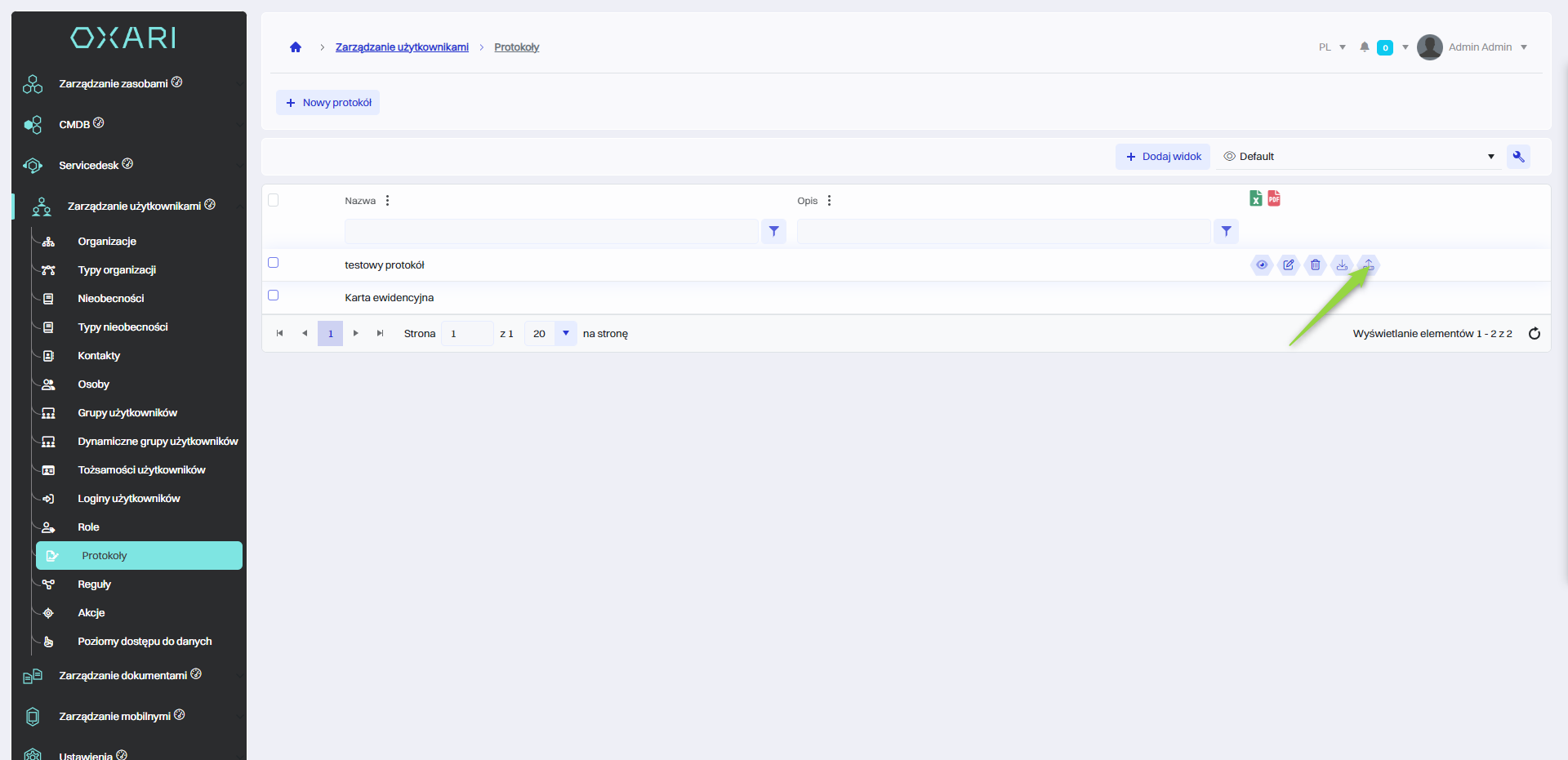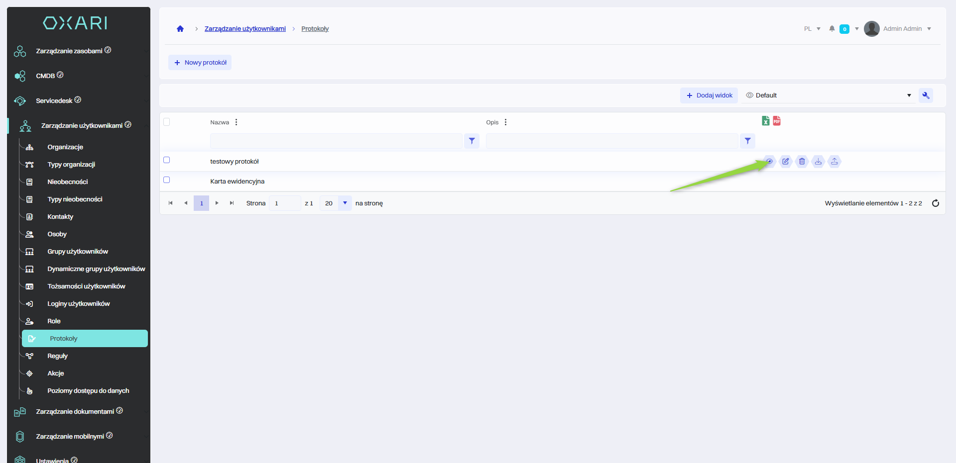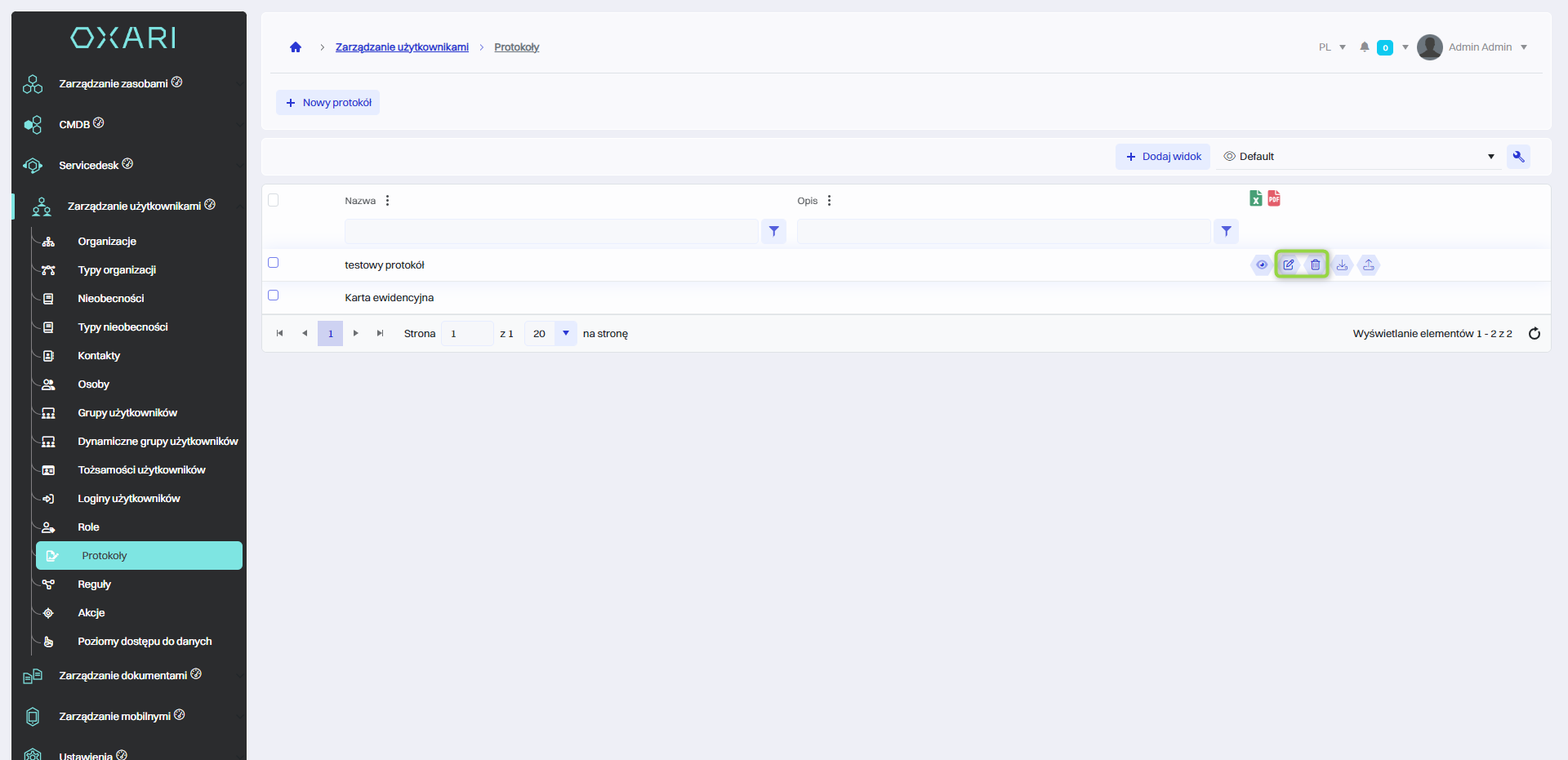 Aby edytować lub usuwać protokół, należy przejść do sekcji Zarządzanie użytkownikami > Protokoły . Najechać na pożądany protokół. Wyświetlą się przyciski do edytowania/usuwania.