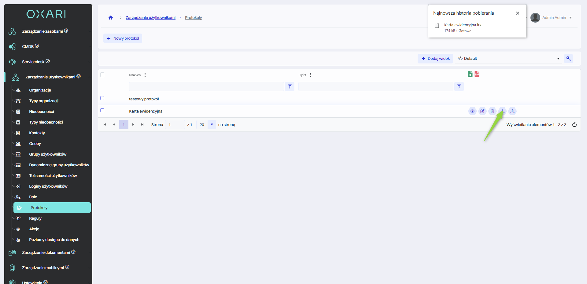 Jeżeli użytkownik chce wgrać swój wcześniej stworzony protokół, należy przejść do sekcji Zarządzanie użytkownikami > Protokoły. Najechać na pożądany protokół. Wyświetli się przycisk do pobierania. Wymagany format to “.frx”.