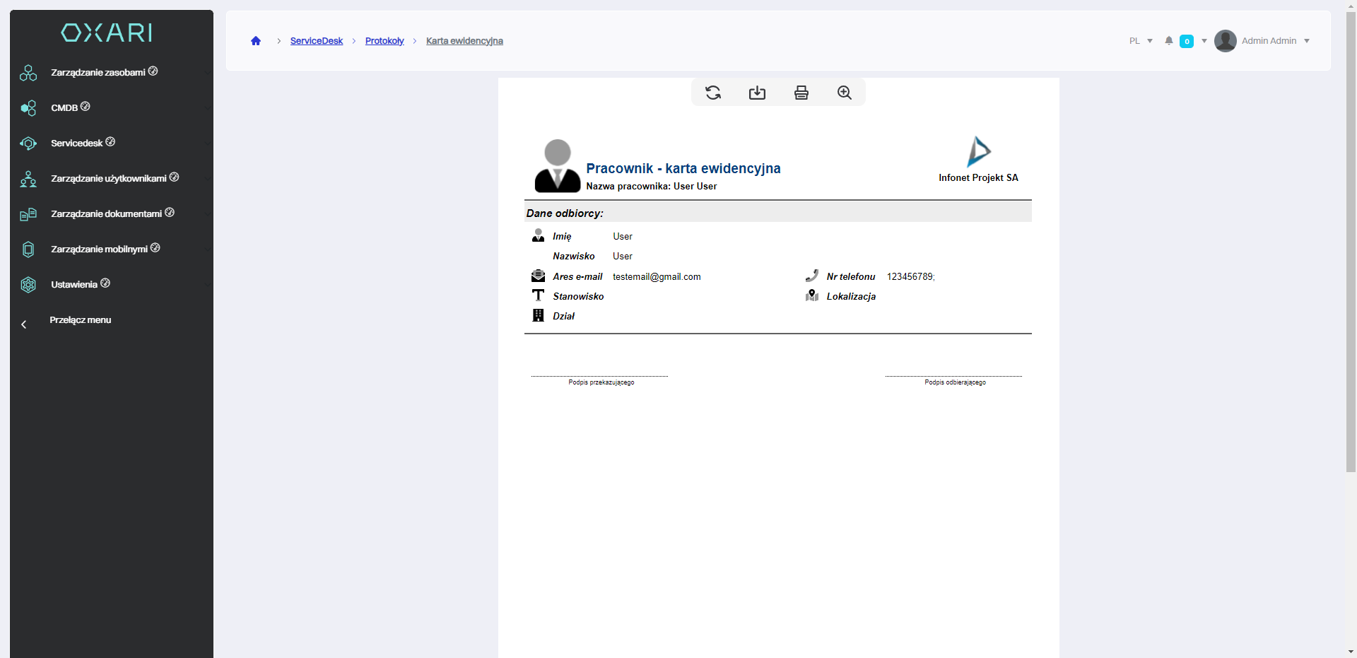W systemie zarządzania użytkownikami OXARI funkcja protokołów umożliwia tworzenie różnego rodzaju dokumentów wyjściowych, takich jak protokoły czy raporty, na przykład “Karta ewidencyjna”. Narzędzie "FastReport Online Designer" pozwala na projektowanie szablonów protokołów, które mogą zawierać różnorodne atrybuty. Dzięki temu użytkownik może generować spersonalizowane protokoły , które odzwierciedlają specyficzne informacje.
