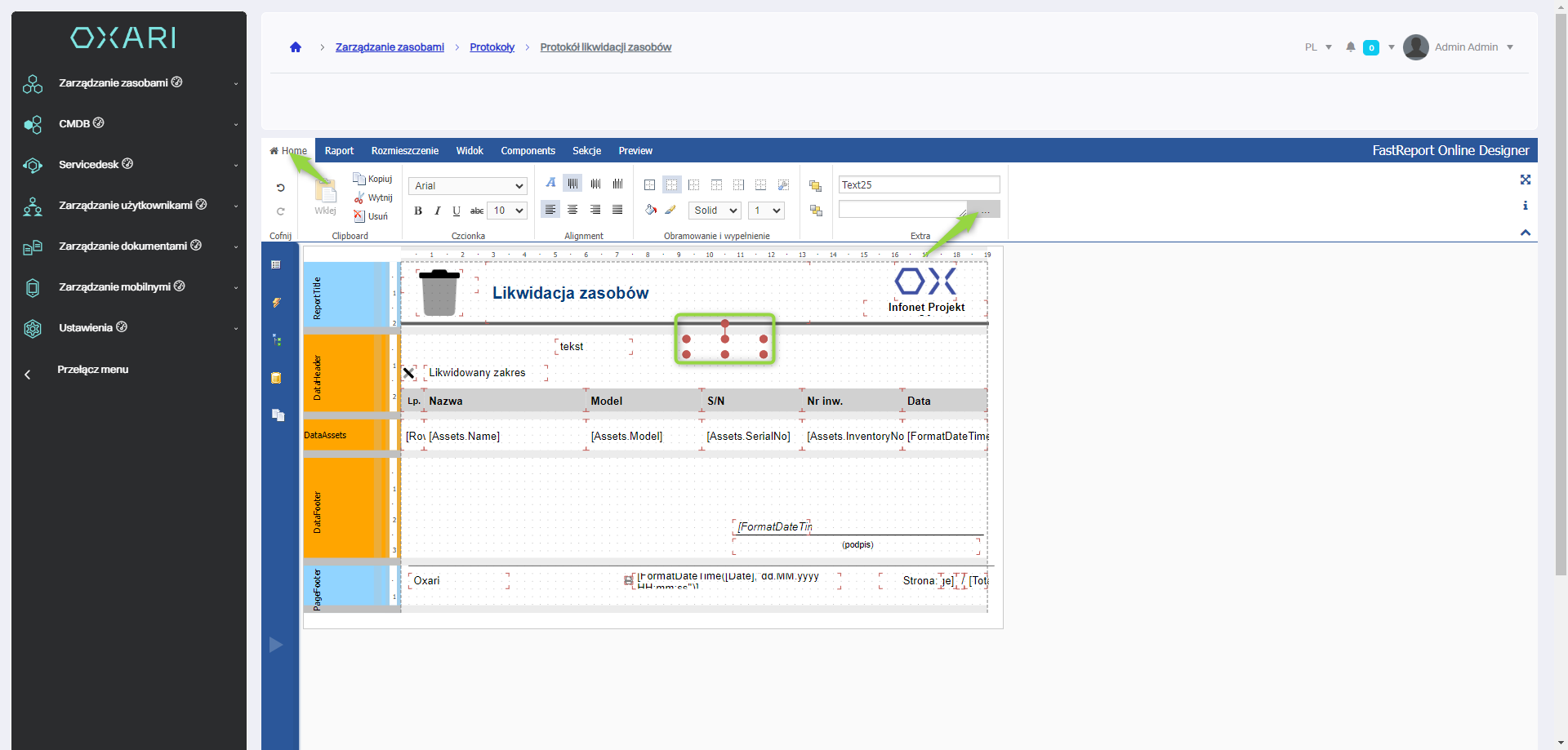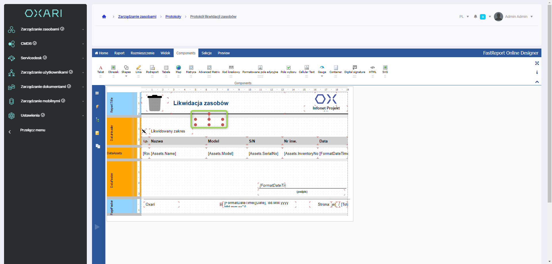 Funkcja "Protokoły" umożliwia tworzenie i zarządzanie dokumentacją związaną z aktywami organizacji, taką jak dokumenty przekazania, ewidencji, czy likwidacji zasobów. Dzięki narzędziom takim jak "FastReport Online Designer", administratorzy mogą dostosowywać szablony protokołów, włączając do nich niezbędne atrybuty zasobów. To pozwala na generowanie spersonalizowanych dokumentów, które odpowiadają specyficznym potrzebom zarządzania aktywami oraz zgodnością z procedurami wewnętrznymi, ułatwiając tym samym precyzyjne śledzenie i raportowanie stanu zasobów w organizacji.