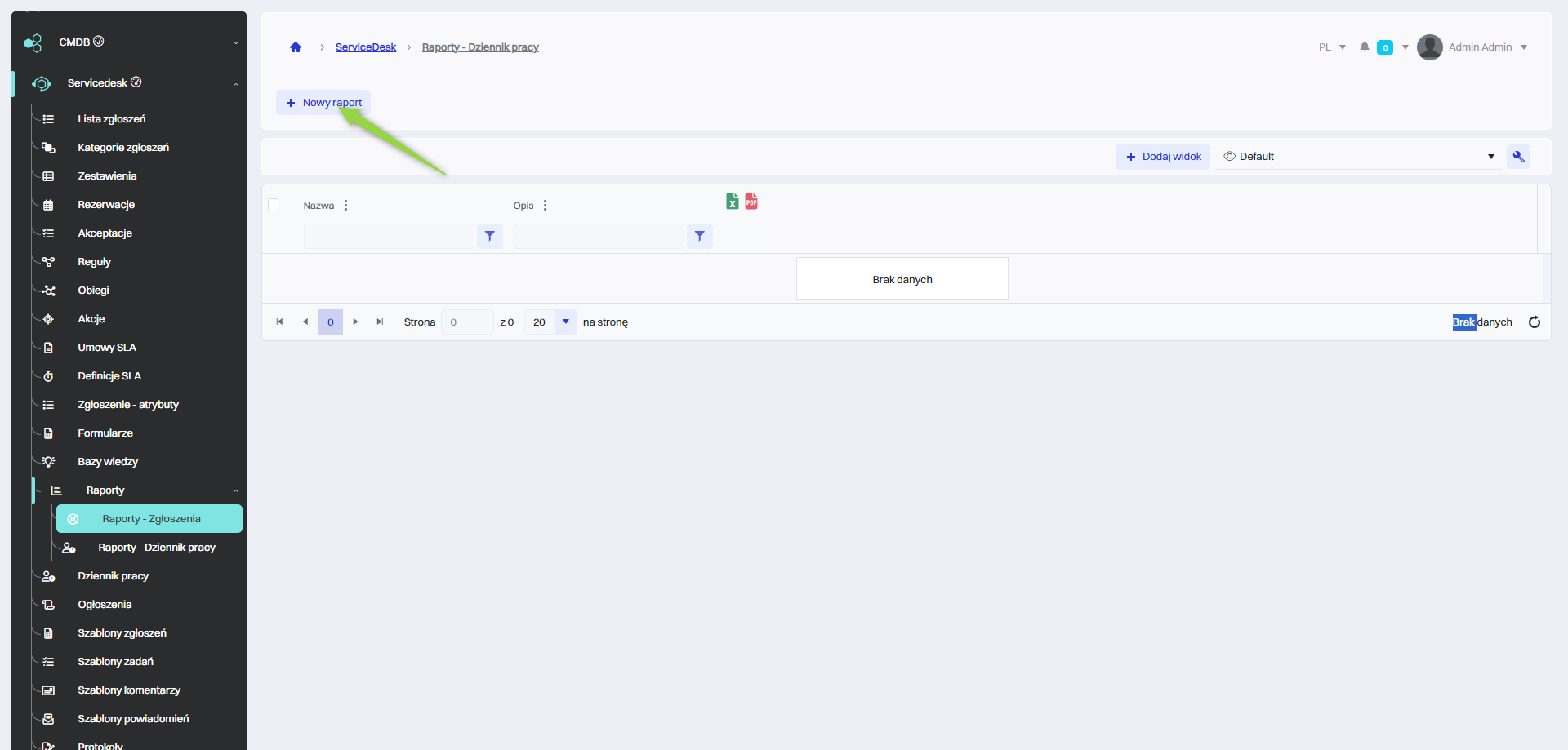 W celu dodania nowego raportu należy przejść do sekcji Servicedesk > Raporty - Dziennik pracy, a następnie kliknąć przycisk “Nowy raport”.