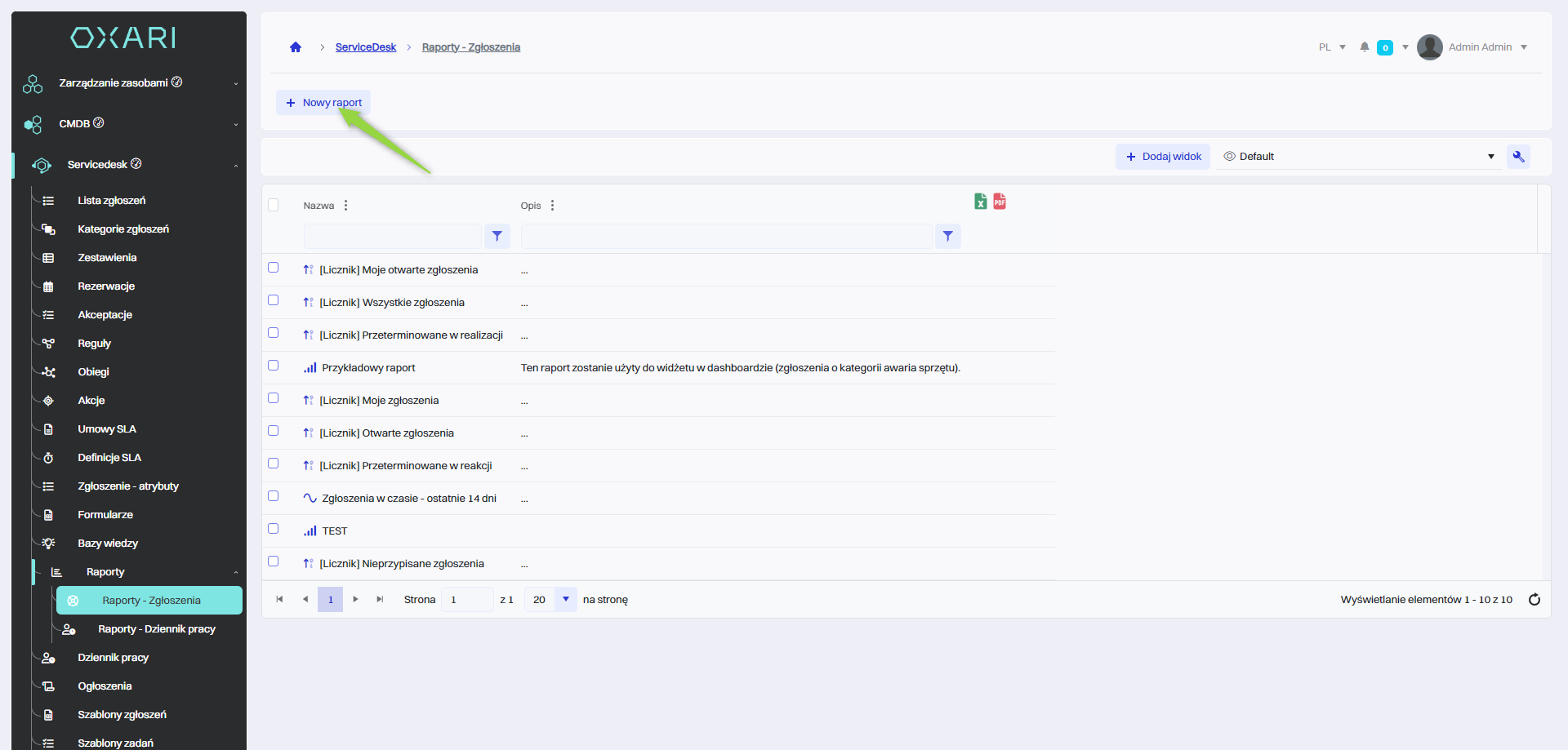 W celu dodania nowego raportu należy przejść do sekcji Servicedesk > Raporty - Zgłoszenia, a następnie kliknąć przycisk “Nowy raport”.