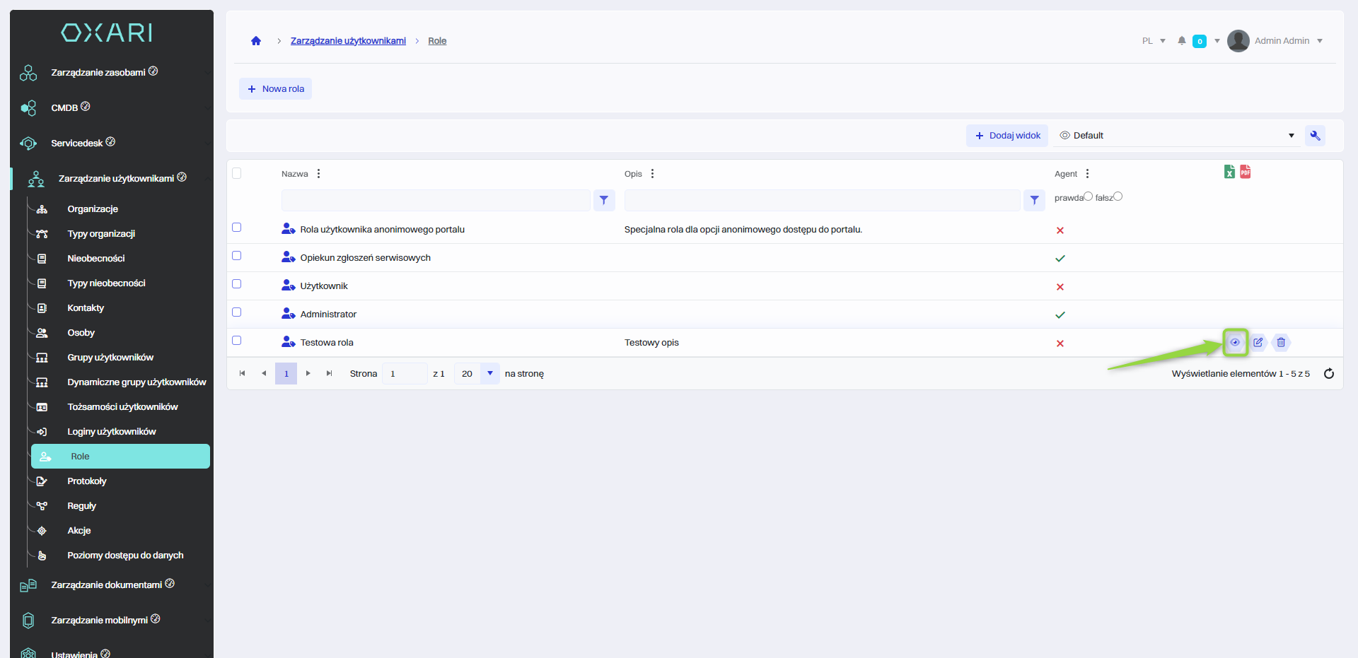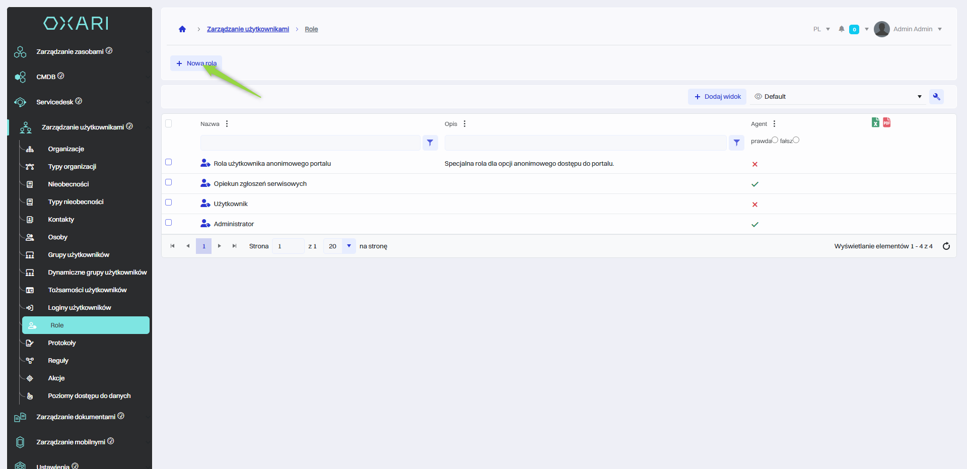 Role te są zasadniczym elementem w zarządzaniu bezpieczeństwem i kontrolą dostępu w systemie, umożliwiając precyzyjne dostosowanie tego, co użytkownicy mogą widzieć i robić w obrębie OXARI. Role są używane w Tożsamościach użytkowników, Grupach użytkowników oraz Dynamicznych grupach użytkowników. W systemie są predefiniowane cztery role: