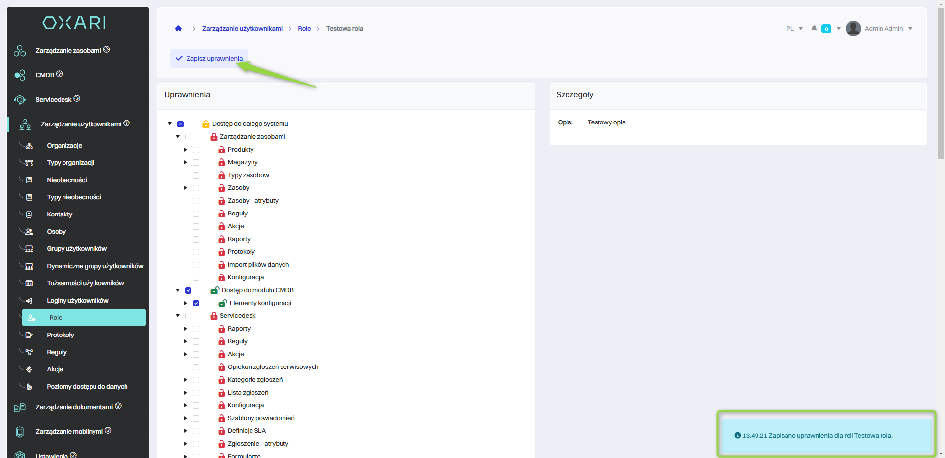 Po zaznaczeniu odpowiednich kategorii należy kliknąć przycisk “Zapisz uprawnienia”. Pojawi się komunikat o zapisaniu uprawnień dla danej roli.