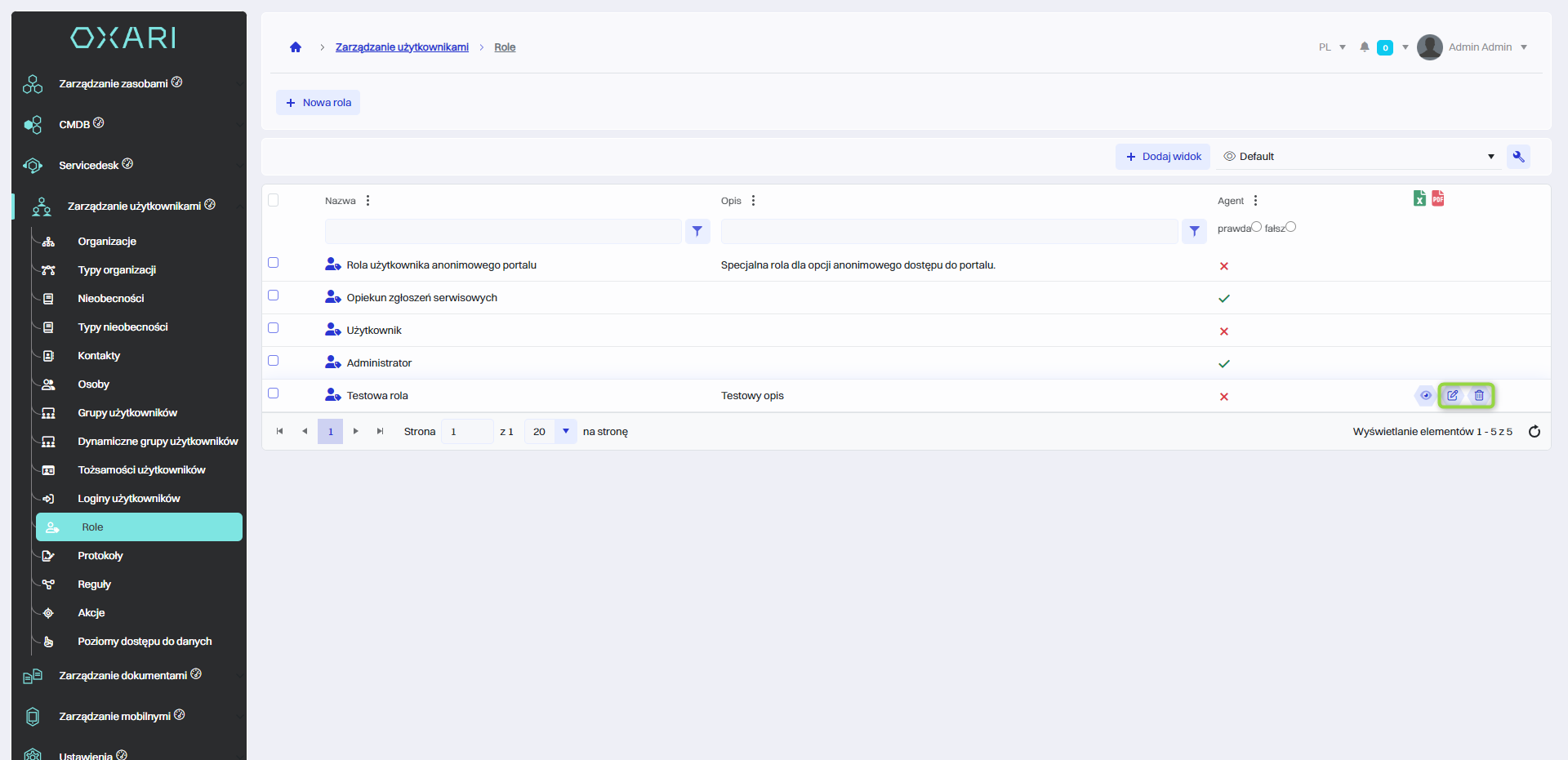 Aby edytować lub usuwać rolę, należy najechać na pożądaną rolę. Wyświetlą się przyciski do edytowania/usuwania.