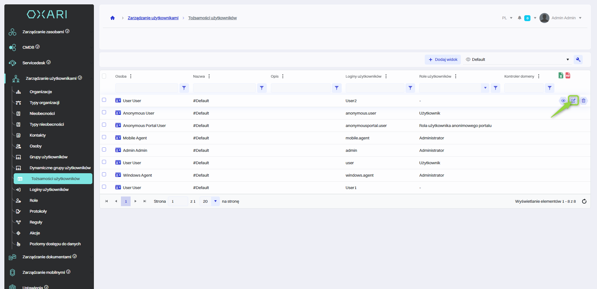 W celu edycji tożsamości użytkownika należy przejść do sekcji Zarządzanie użytkownikami > Tożsamości użytkowników, a następnie kliknąć przycisk “Edytuj” przy pożądanej tożsamości.