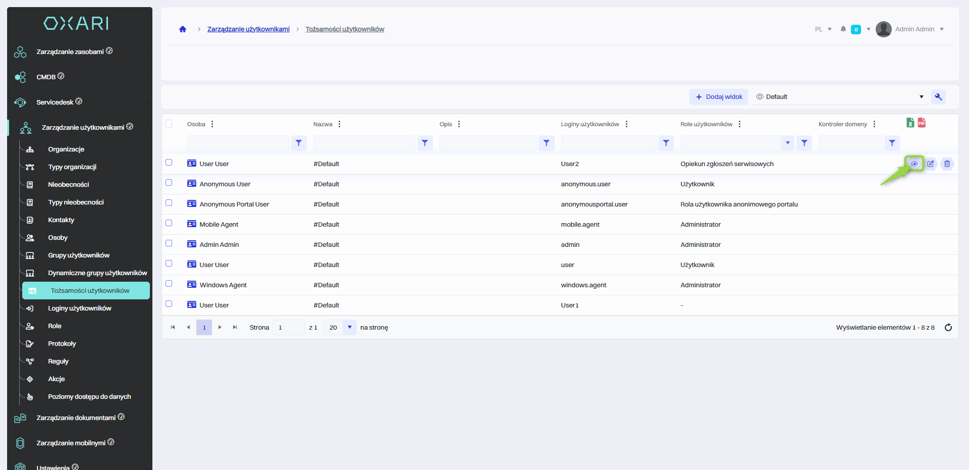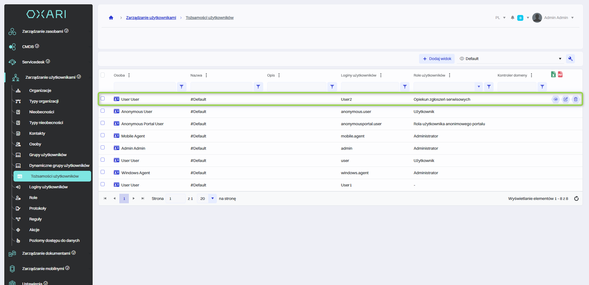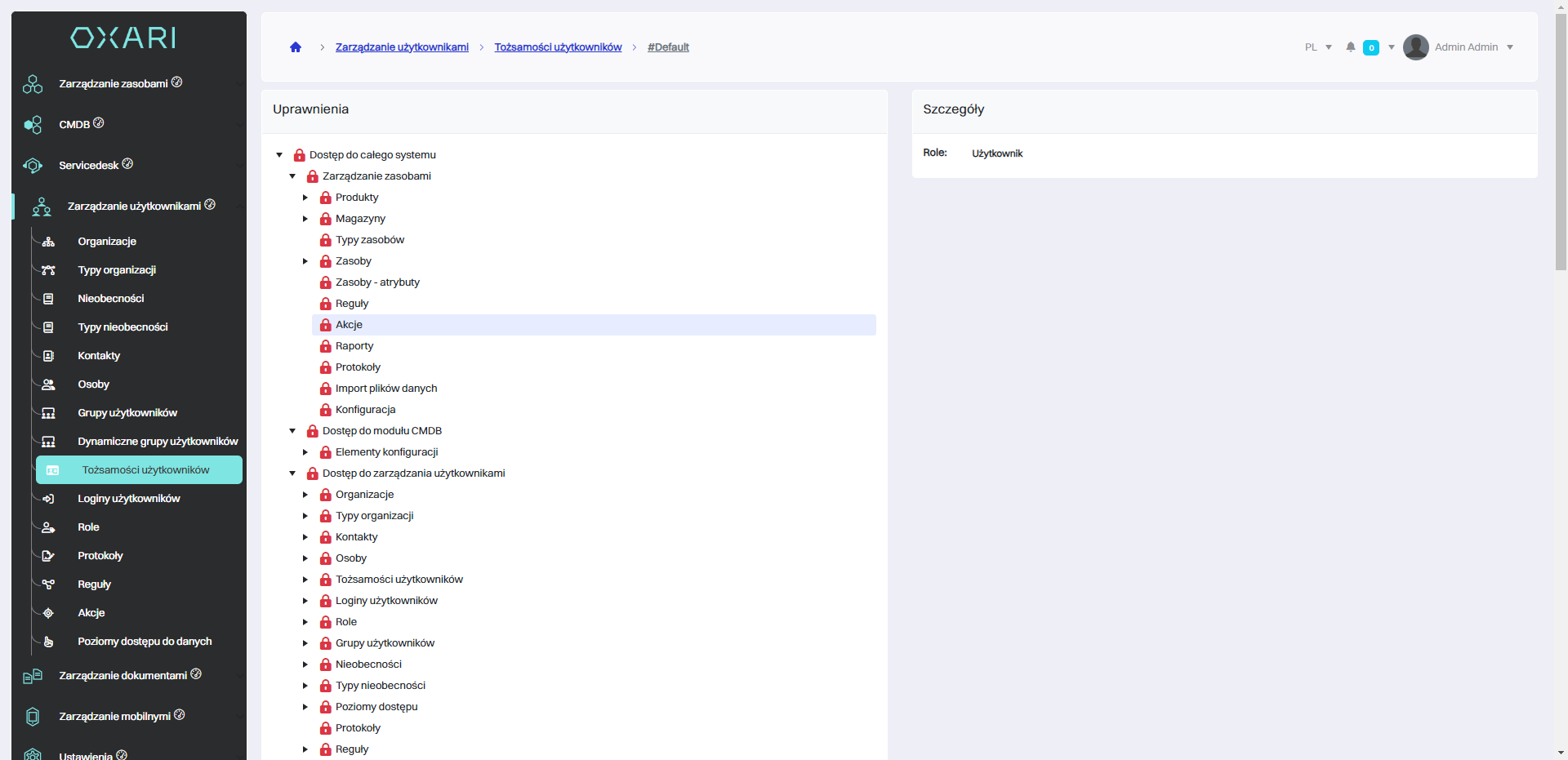 W systemie OXARI, proces tworzenia nowej osoby jest ściśle powiązany z koncepcją tożsamości użytkownika. Każdemu użytkownikowi, po jego dodaniu do systemu, przypisywana jest unikalna tożsamość, która staje się podstawą do definiowania i nadawania odpowiednich uprawnień. Sekcja “Tożsamości użytkowników” pozwala na precyzyjne dostosowanie poziomu dostępu pojedynczego użytkownika dzięki mechanizmowi ról z sekcji Zarządzanie użytkownikami > Role.