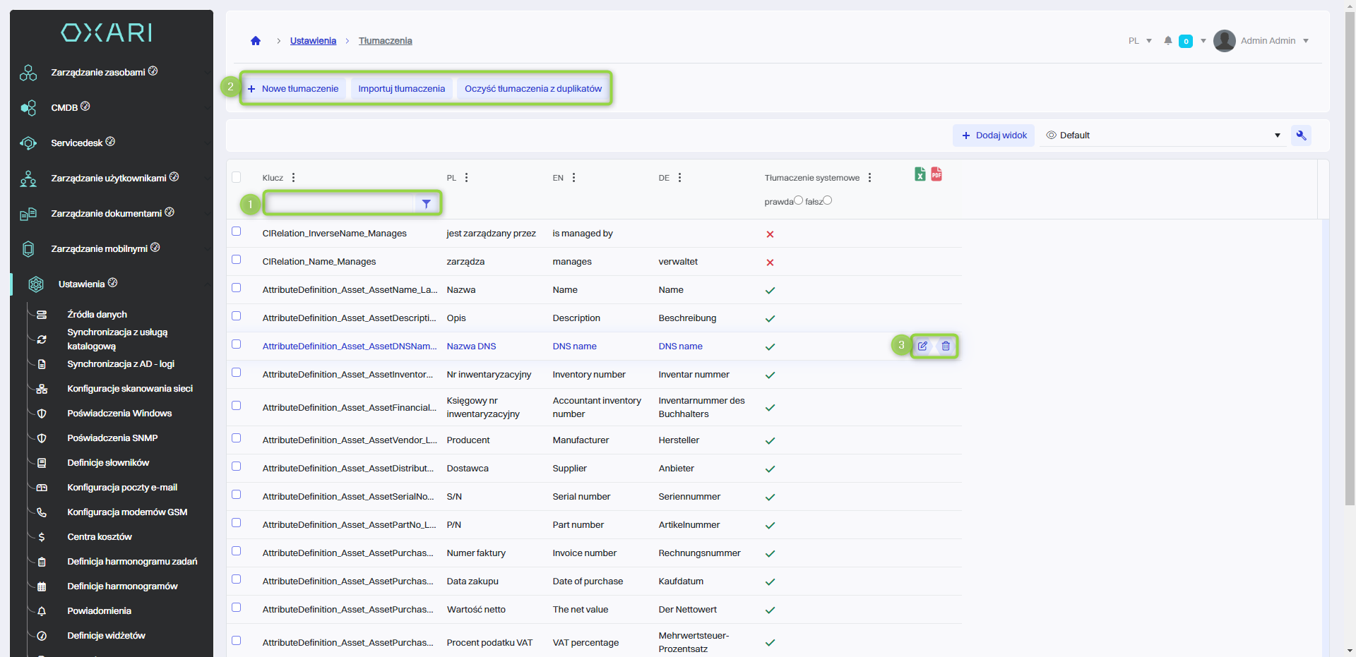 Przycisk "Nowe tłumaczenie" - Ten przycisk jest używany do dodawania nowego wpisu tłumaczeniowego do systemu. Po jego naciśnięciu, użytkownik może wprowadzić nowy klucz i jego odpowiedniki w różnych językach.